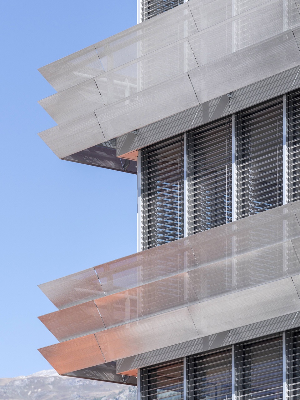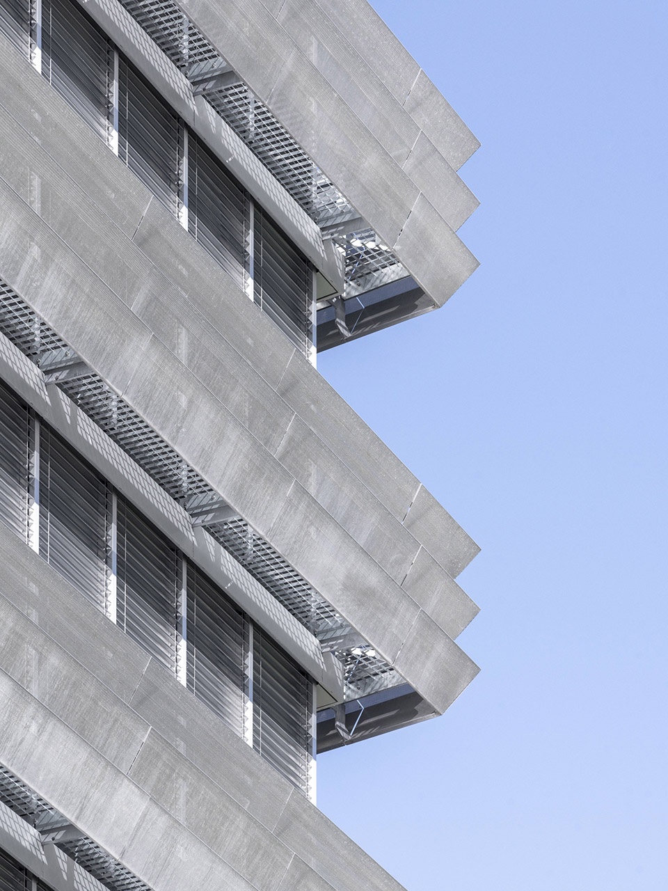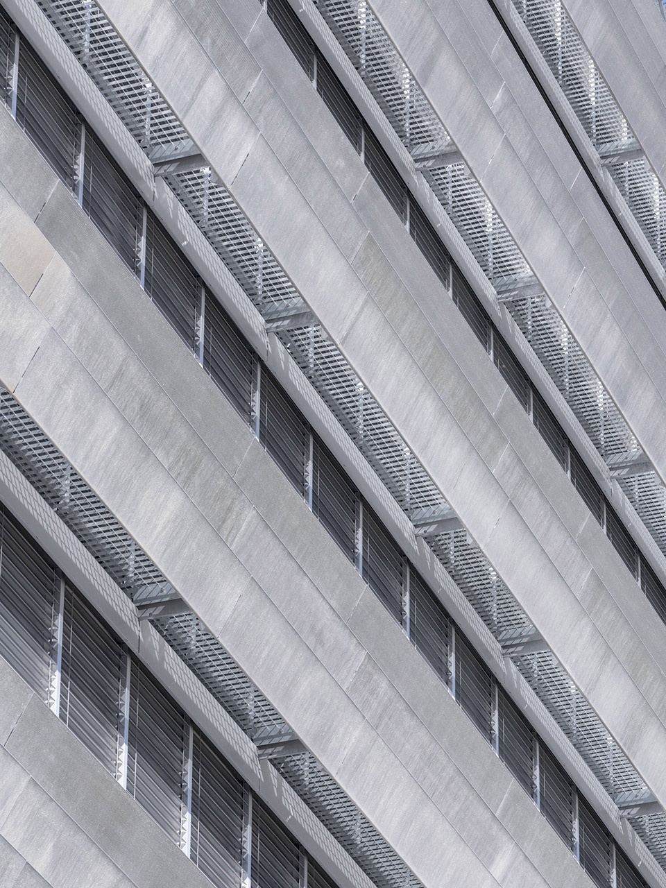 The glazed façades are fitted with polished stainless steel pleated cladding acting as guardrails, which reveal the building’s structural rhythm. The interior materials are sober and refined: exposed concrete, transparent or tinted glass, and aluminum cladding elements.