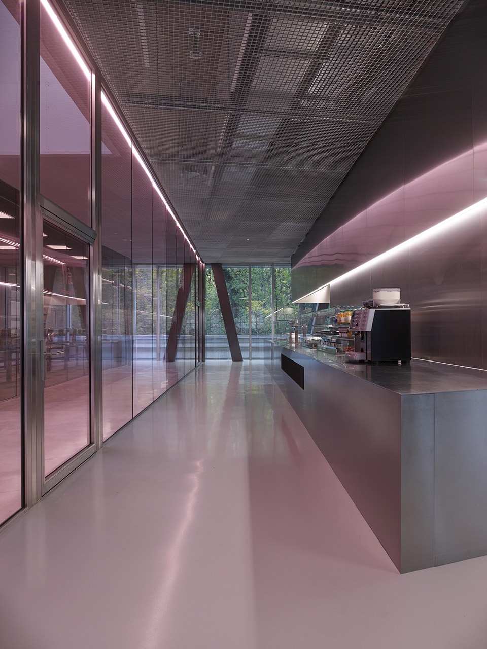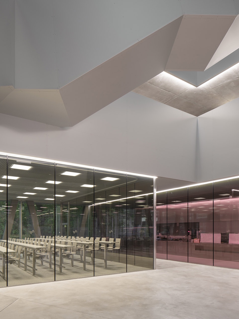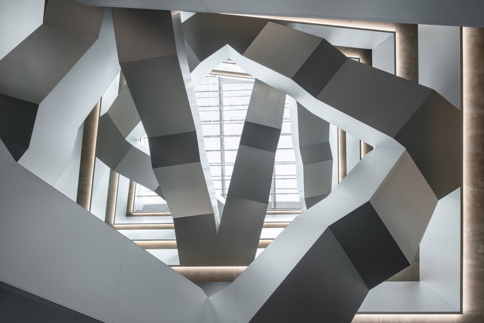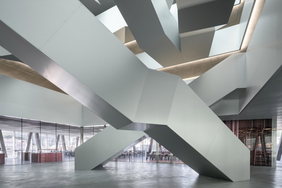 玻璃幕墙外部设置了由抛光不锈钢折板组成的护栏,不仅增强了安全性,也揭示了建筑的结构节奏。室内材料选用简洁精致的表达:清水混凝土、透明或着色玻璃、铝质包覆构件,营造出克制而高雅的空间氛围。