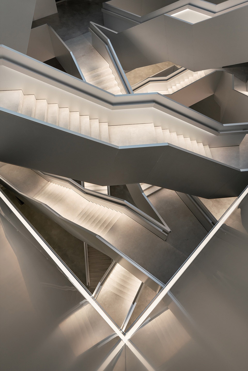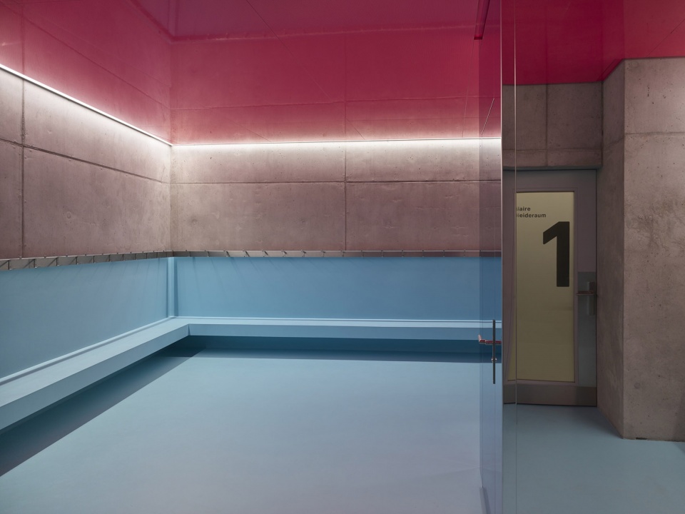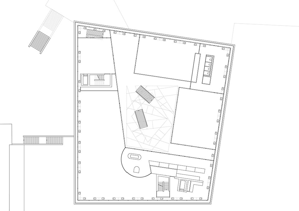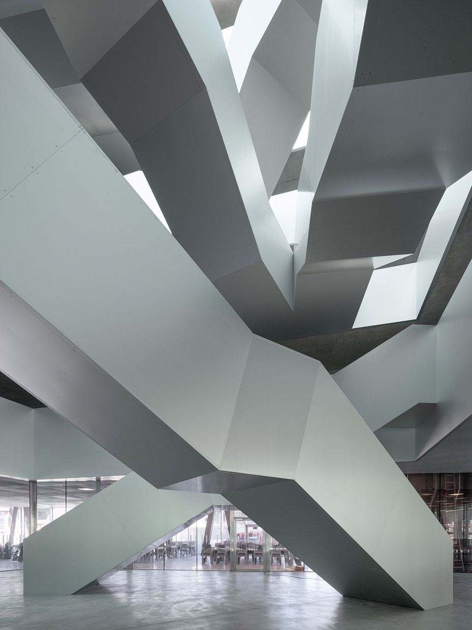 玻璃幕墙外部设置了由抛光不锈钢折板组成的护栏,不仅增强了安全性,也揭示了建筑的结构节奏。室内材料选用简洁精致的表达:清水混凝土、透明或着色玻璃、铝质包覆构件,营造出克制而高雅的空间氛围。