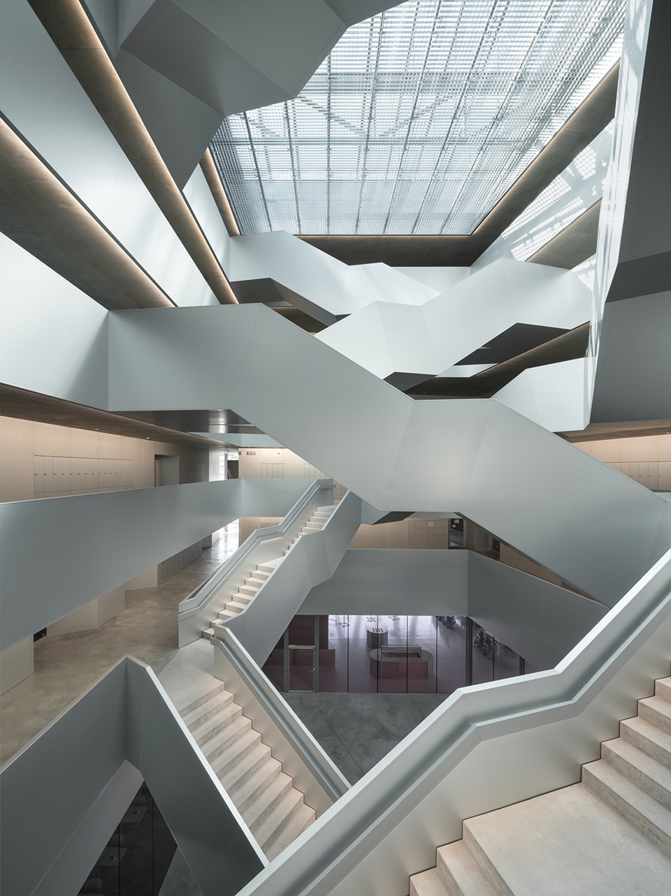 建筑设计采用了契合该教育阶段需求的功能布局。环形教室带由阳台式的走廊服务,并环绕一个充满自然光的大型中央空间。这个由雕塑般楼梯赋予动态感的中央空间,成为整座学校的空间核心与象征焦点。围绕核心布置的教室具有不同朝向与采光条件,营造出丰富多样的学习环境。