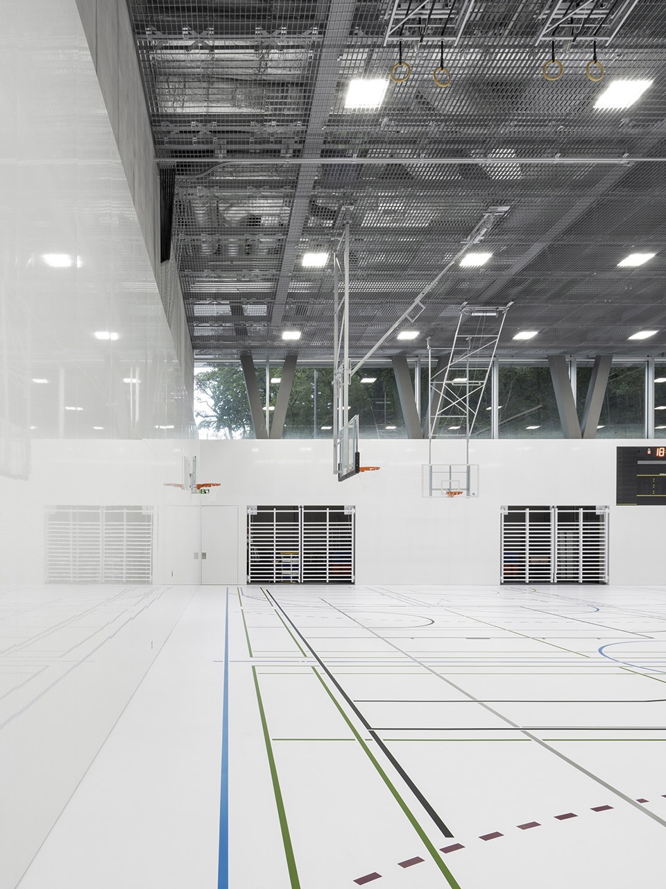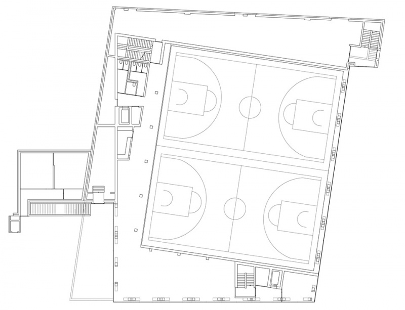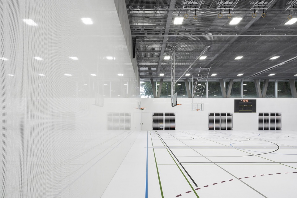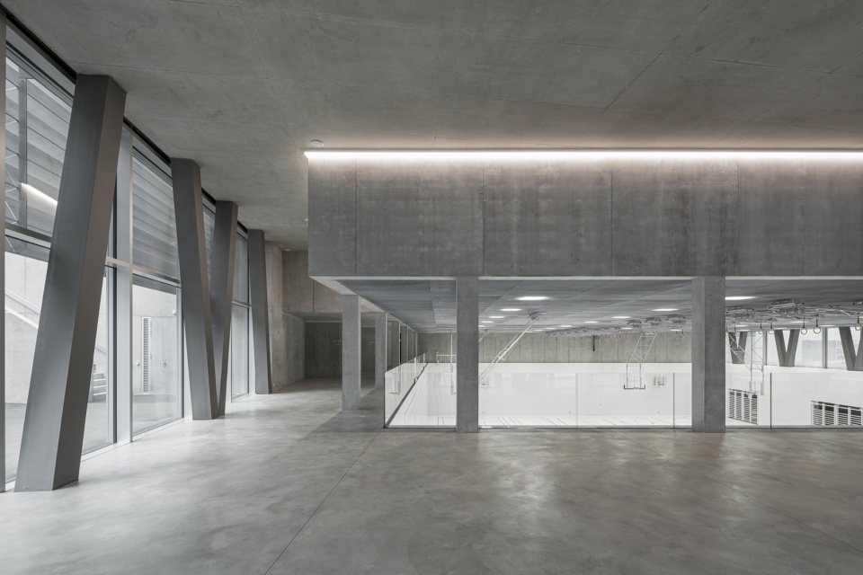 混凝土结构巧妙应对了在双层高体育馆之上叠加教学功能的挑战——通过将四面主要结构墙体的荷载传递至建筑外围,从而形成V形结构支撑,这一构造同时确保了抗震稳定性。