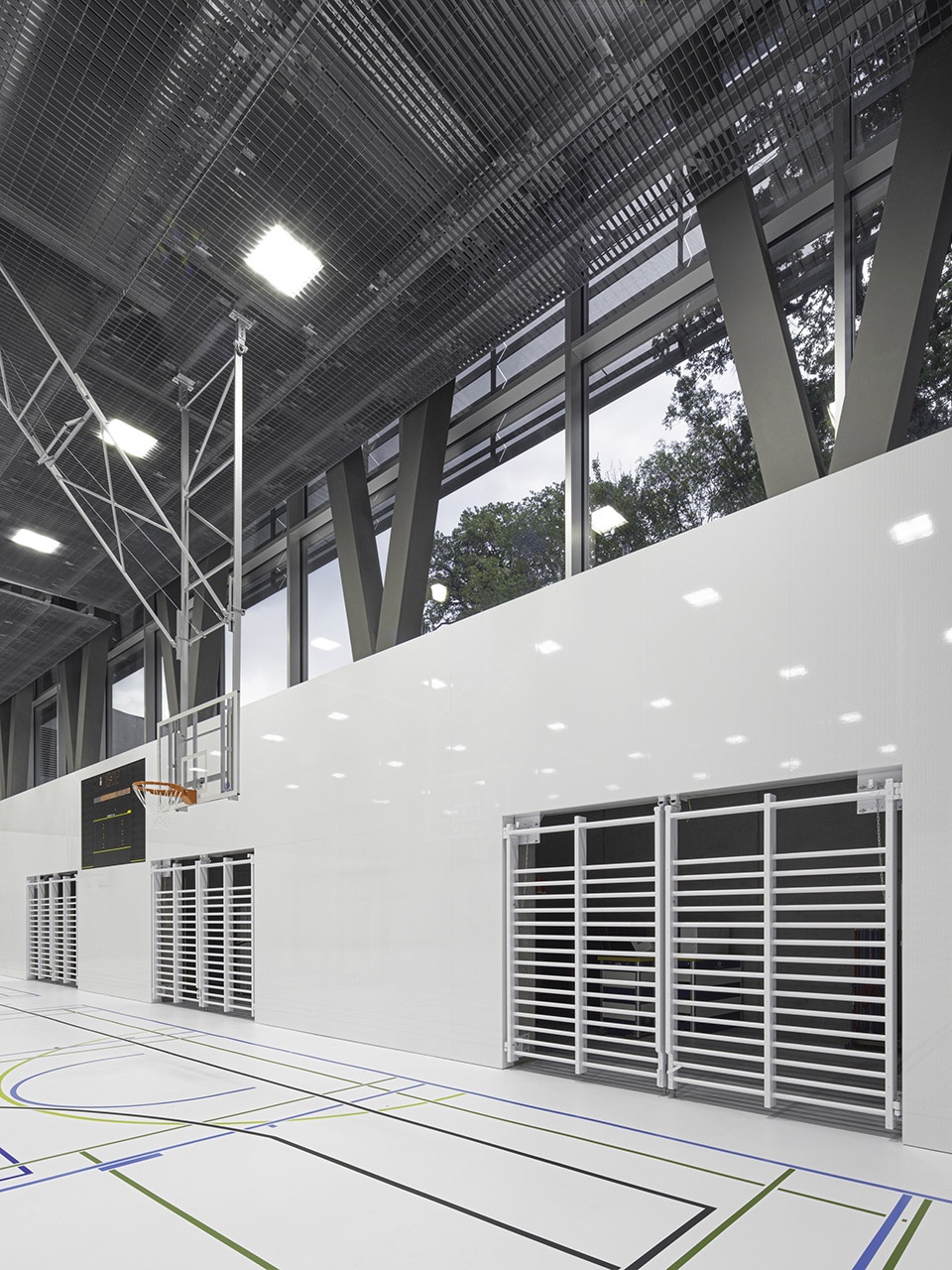 The concrete structure addresses the challenge of layering school functions above a double gymnasium by transferring the loads from the four major structural walls to the perimeter. This results in V-shaped structural supports that also ensure seismic stability.