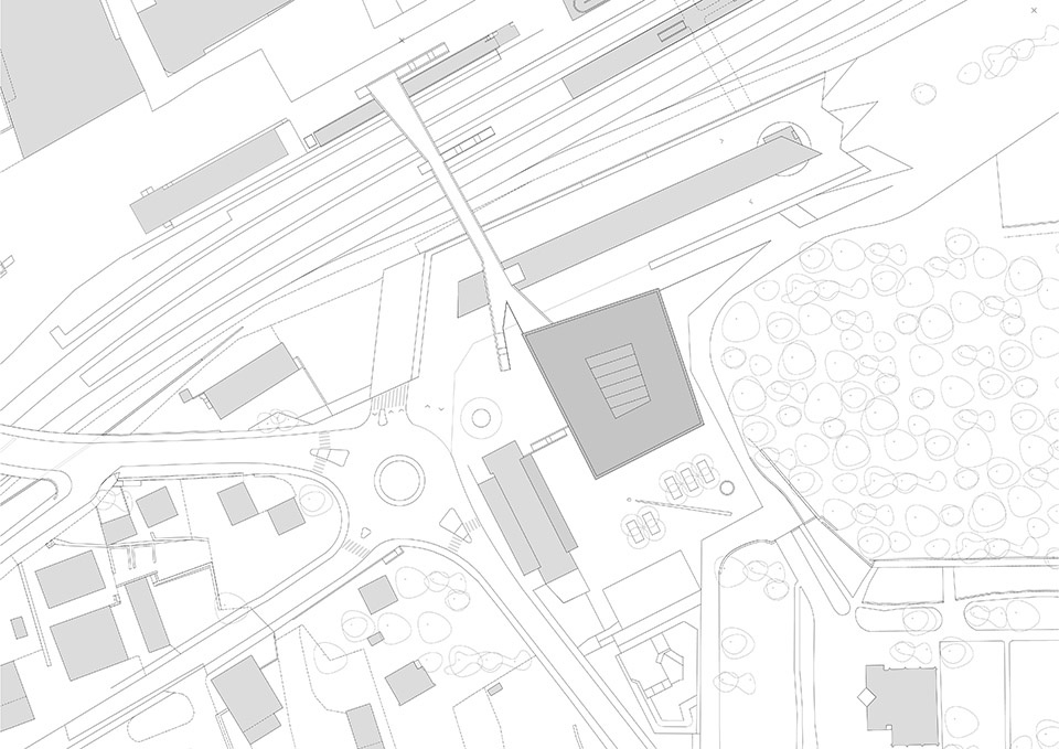 项目场地呈现出两个主要标高:一是朝北面向SBB车站、向西面向Route de la Monderèche;二是朝南与东部开放,连接Bellevue平原。学校建筑恰好跨越这一高差,使不同功能区得以清晰划分。学校设有两个出入口:一个位于公交车站标高,另一个位于连接城市北部与SBB车站的人行天桥标高。体育馆的出入口则位于下层。