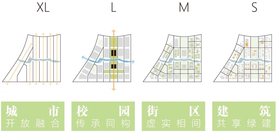 规划在东西向沿用地边界以150~180米的尺度将校园划分为城市尺度下的适宜街区,并吸取中国古代书院并置布局的形制,将教学与生活功能沿南北线性排布,形成较强的场所秩序感。东西向则由道路、广场、绿化、河道等横切形成相对自由的界面。规划强调街区内外部开放共享空间的营造,从空间、交通、功能等层面为校园未来融入城市、服务周边提供了物理层面的可操作性。
