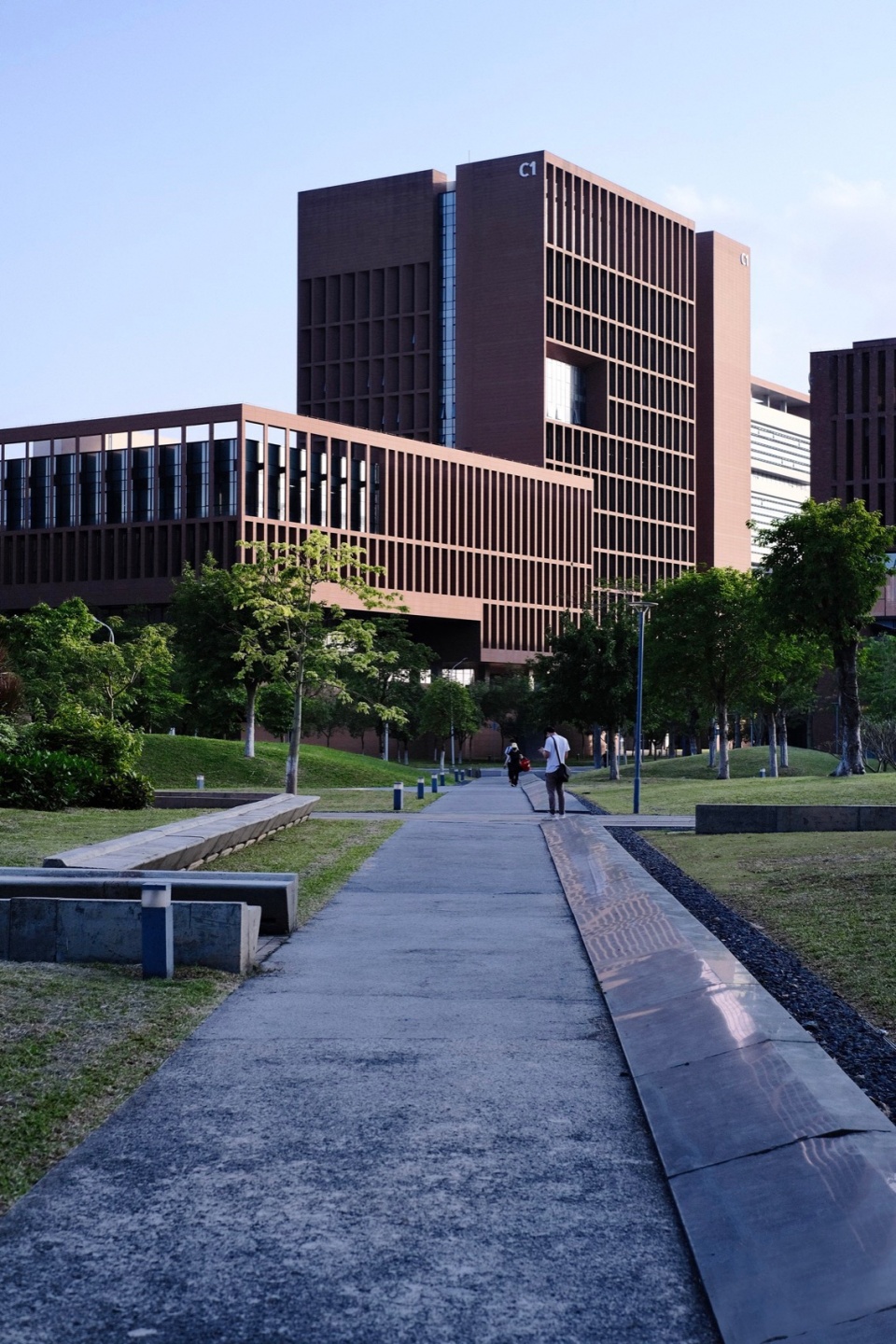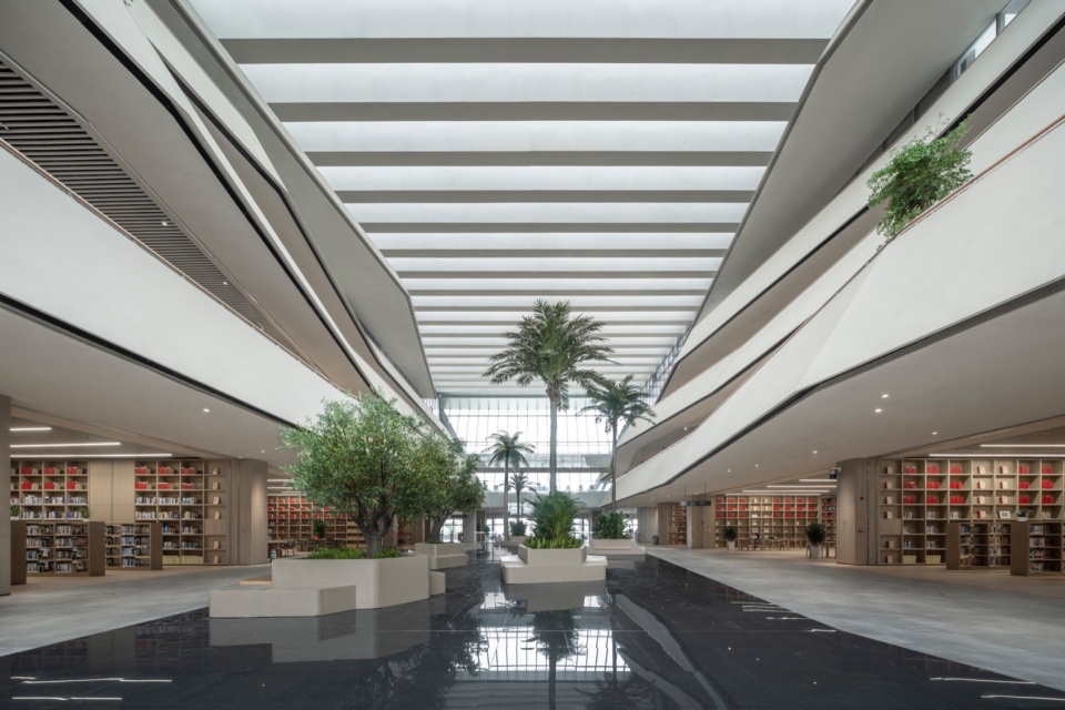 规划精准契合岭南地区地域性气候特征,构建了系统化的绿色校园体系:类“梳式布局”的地域化冷巷式通风体系,组织了更有效的自然通风;通过带状水系与其向南北延伸的雨洪海绵走廊,汇集各类地表径流并导向城市管道;校园街区内部的折线景观带、空中连廊、步行支路等组成连贯的立体步行系统,辅以电能公交、自行车等,实现校园的绿色交通体系;校园各建筑单体达到了绿色建筑二星评价标准,图书馆则是达到了绿色建筑三星评价标准。