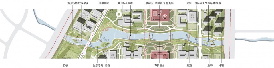 以东西滨水景观带为界,校区南岸为教学功能区,实验楼、图书馆、教学楼设置在中心区域,各学院围绕周边布置。校区北岸为生活配套区,分布着文化活动中心、运动场馆、学生宿舍与餐厅、创新创业基地和教师公寓等。南北两岸通过立体交通系统和滨水景观体系,构建充满活力的滨水公共空间。