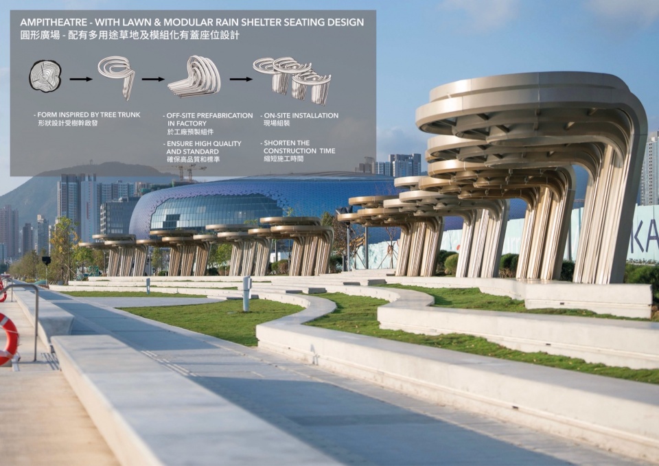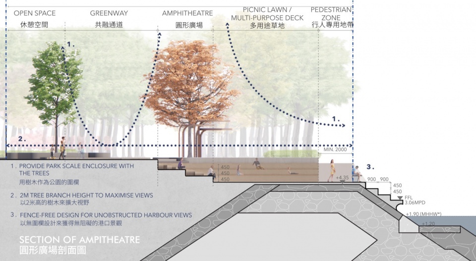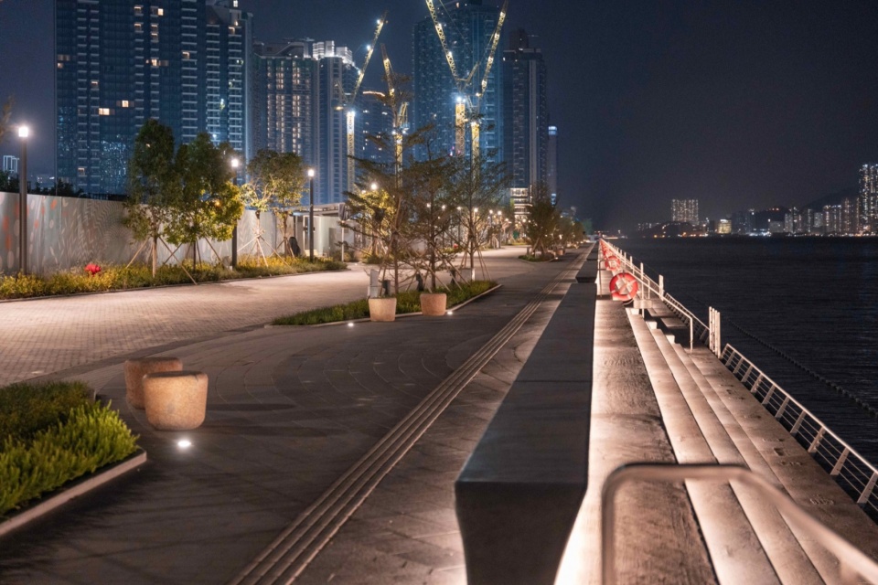 该项目的一大特色在于其对水岸边界的处理方式。长达600米的滨海阶梯设计,让公众能直接亲近水体,此种设计在香港相对罕见,能有效促进市民与海滨的互动。该设计决策反映出一项更为宏大的意图——致力提升维港的可达性与休闲功能,使其更贴近日常使用需求。