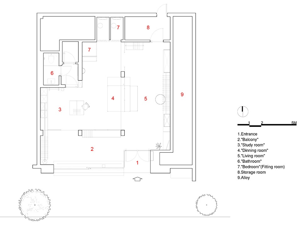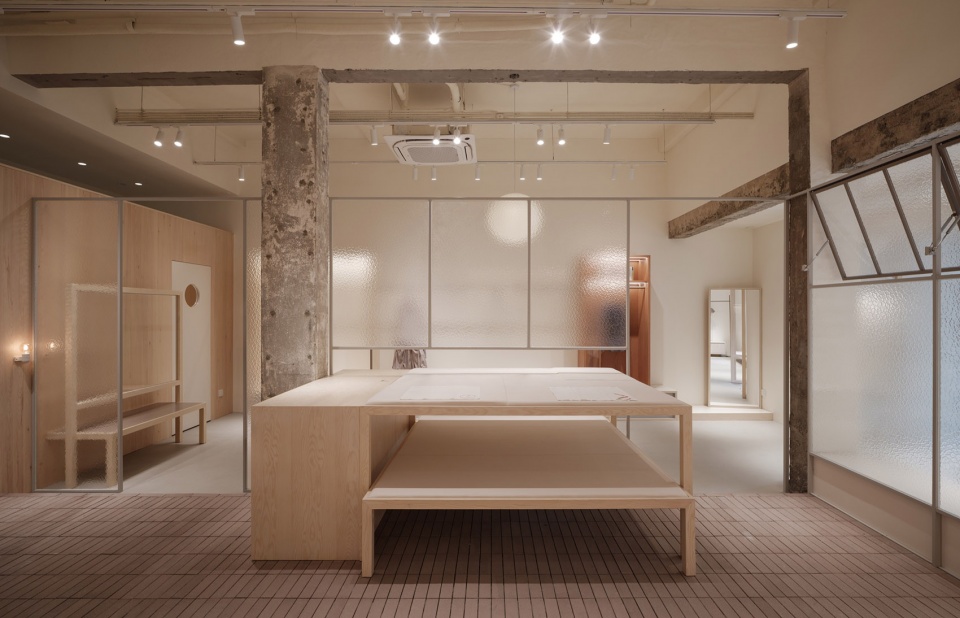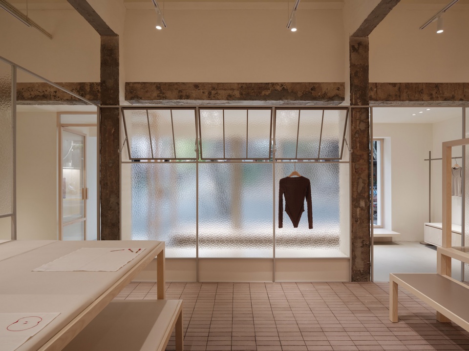 “自然尺寸”是品牌提出的生活原则,在空间设计中我们也始终贯彻“自然尺度”。空间划分从建筑原始结构出发,不同“单元”的界限是模糊的,不明确的,甚至是相互交织的,包括外部与内部的边界。这里是一个“总是可以随时闯入”的空间,从室内“阳台”延伸到室外的座椅,让路过的人可以自然地落座休憩;内退的大门自然地形成玄关空间。