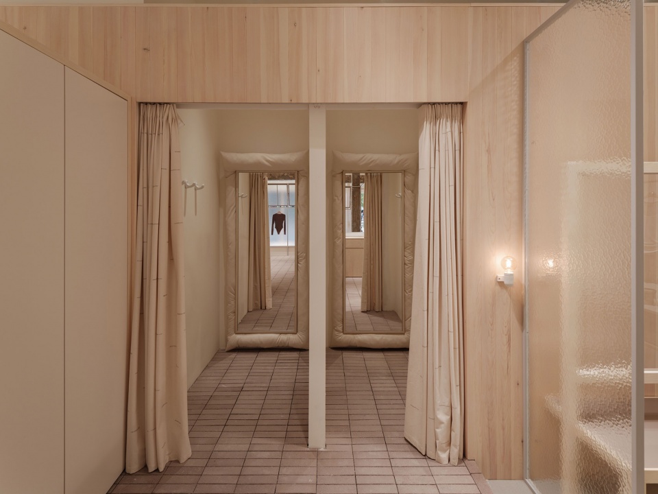 Every element in these “units” emerges organically from the spatial context. Product displays avoid artificial arrangements, instead appearing as naturally as objects in daily life. The open transom windows on the balcony casually hang “air-drying” garments; the space’s sole dark wood cabinet stands like a cherished antique, displaying treasured items within. Clothing rails meander effortlessly between cabinets and walls, while a cleverly combined dining table and sofa bridge different functional zones. Even the wardrobe transforms – step inside and you’ll find yourself in a fitting room, where mirrors embedded in pillow walls create an embrace-like trying-on experience.