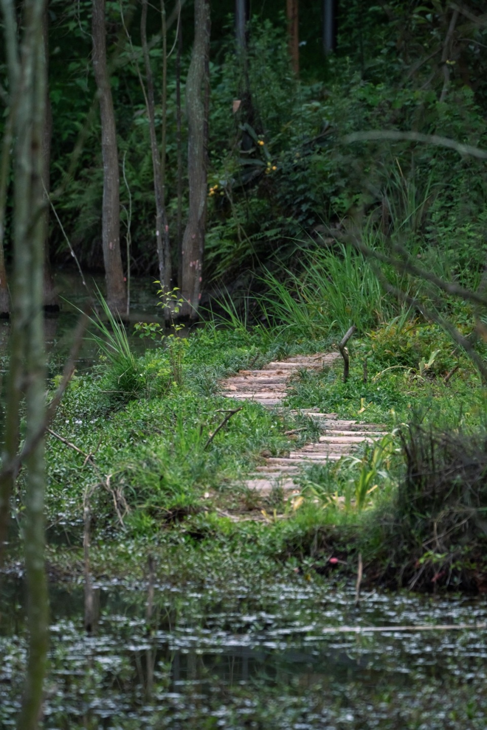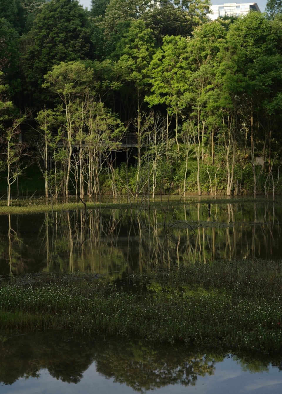 在已有的优质肌理上,我们做了一次细致的整理:疏通低洼积水、适度拓展浅滩,并自然调整驳岸形态,恢复它的生态的连贯性,让原本被割裂的水林关系重新缝合。靠近人群的区域,以滨水木栈道来串联动线,在不过多打扰原生环境的前提下,引导人们走近湿地、体会自然。这一过程中,场地原有的生态潜力更加显现,甚至在某些视角下,像川西山脚下常见的浅滩林缘,自有一份野意。