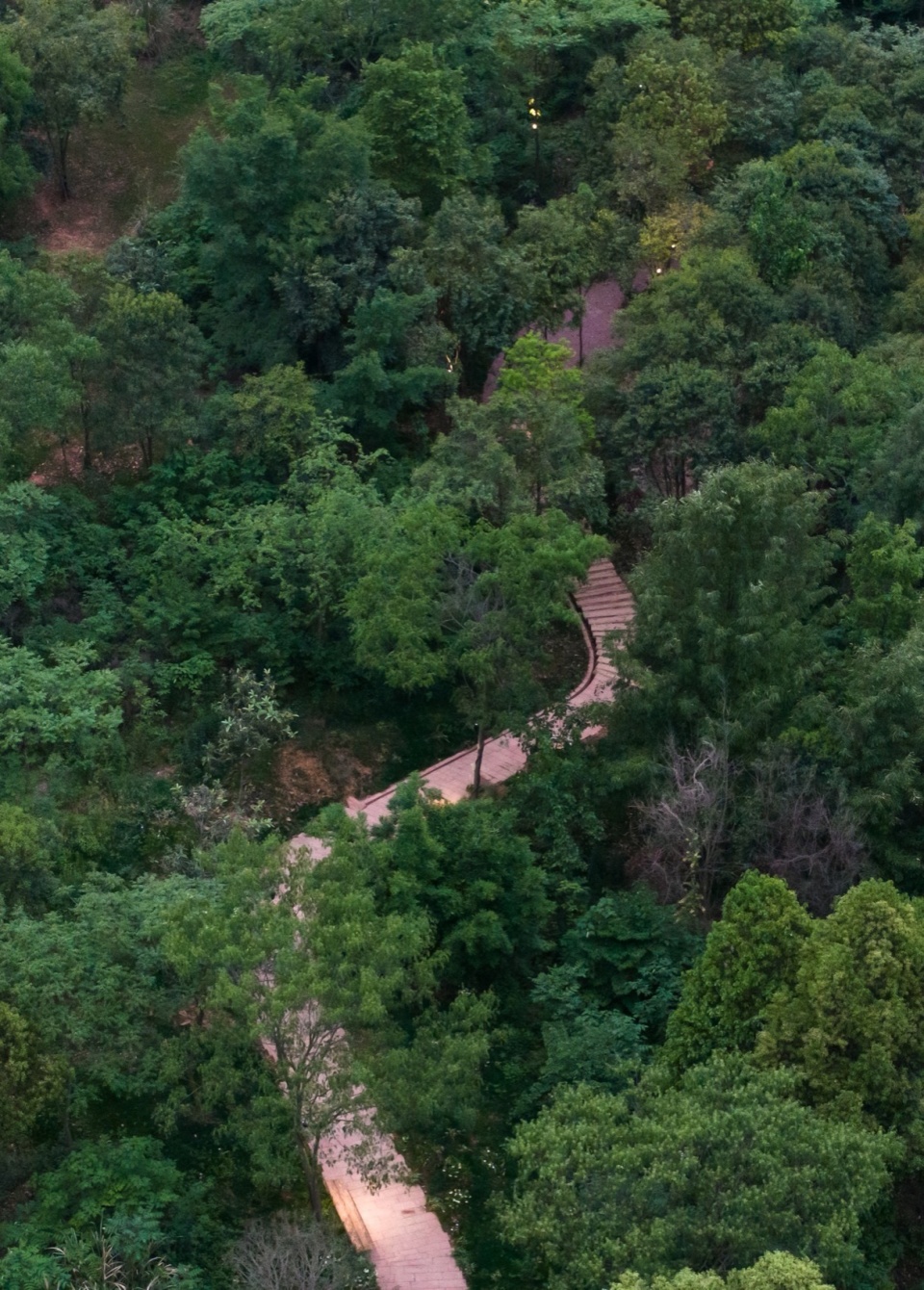 出于对自然、森林演化的探索,我们以“森林下面有什么”为引,向山而行,与山共生,在“城市→森林”之间架构一条渐进式探索之路。步道于自然肌理中展开,沿着山脊线组织动线,避开集中林区和湿地系统,在地势自然抬升或收束位置,形成森林台地与折返节点,引导视线穿越林隙,邀请人们以全新的视角探索麓湖,丈量脚下的山野。