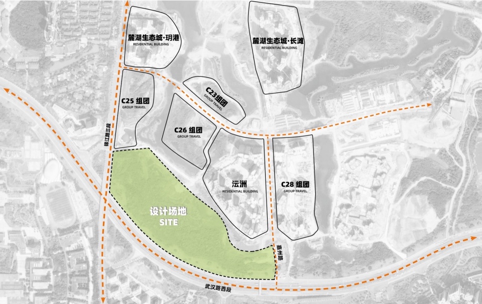 麓野公园位于麓湖生态城南部湖区,呈狭长形态,占地约7万㎡,作为麓湖水城和城市道路之间的公共绿地,紧邻仙踪公园航道水系,连接多个居住组团。