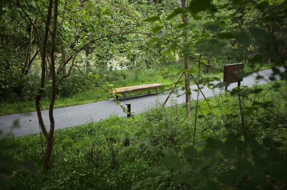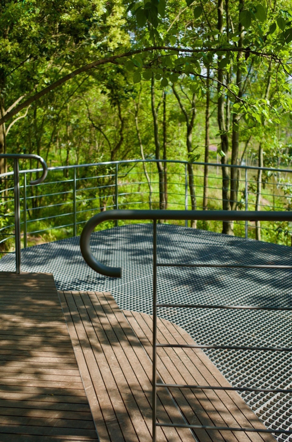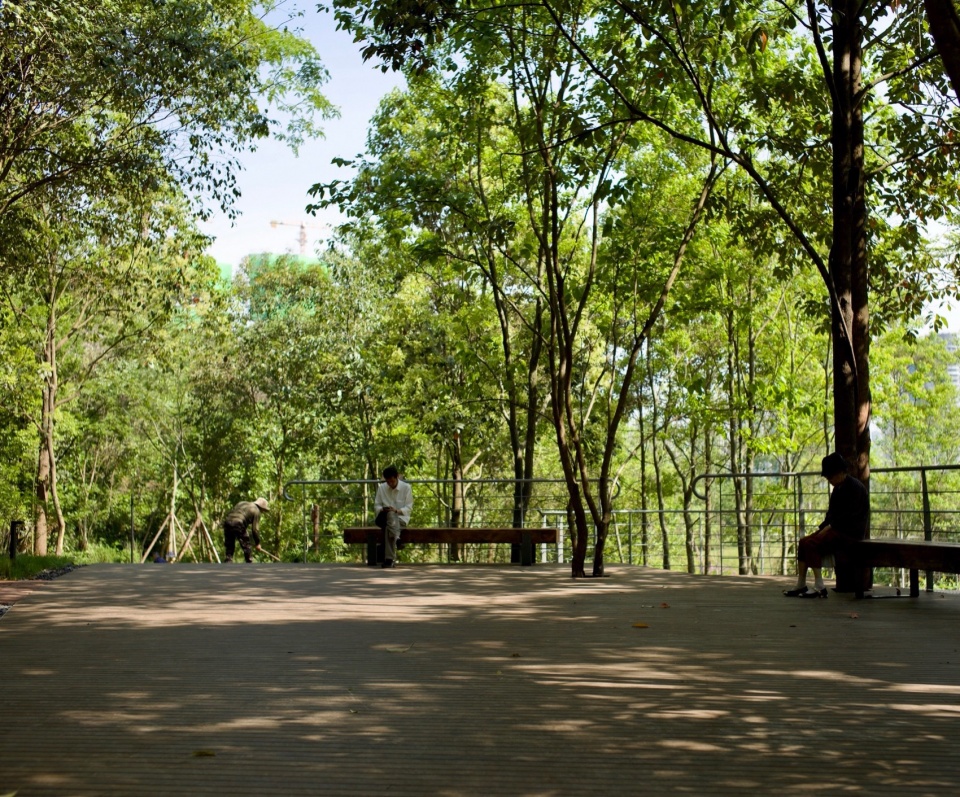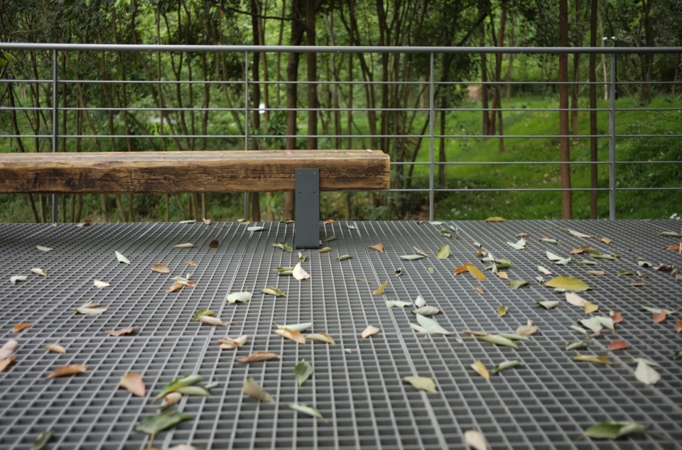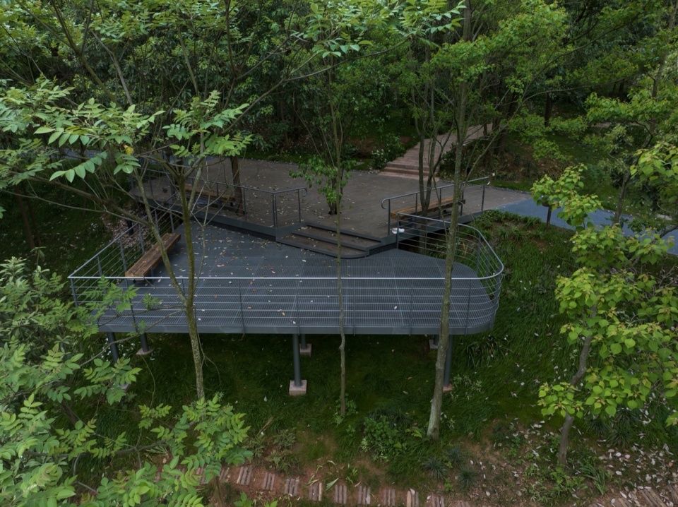 整个平台布局刻意绕开原生香樟林,遇到无法避让的树,则留出生长孔洞,任其穿台而出,在行走和停驻之间,人与自然保持着恰到好处的距离。