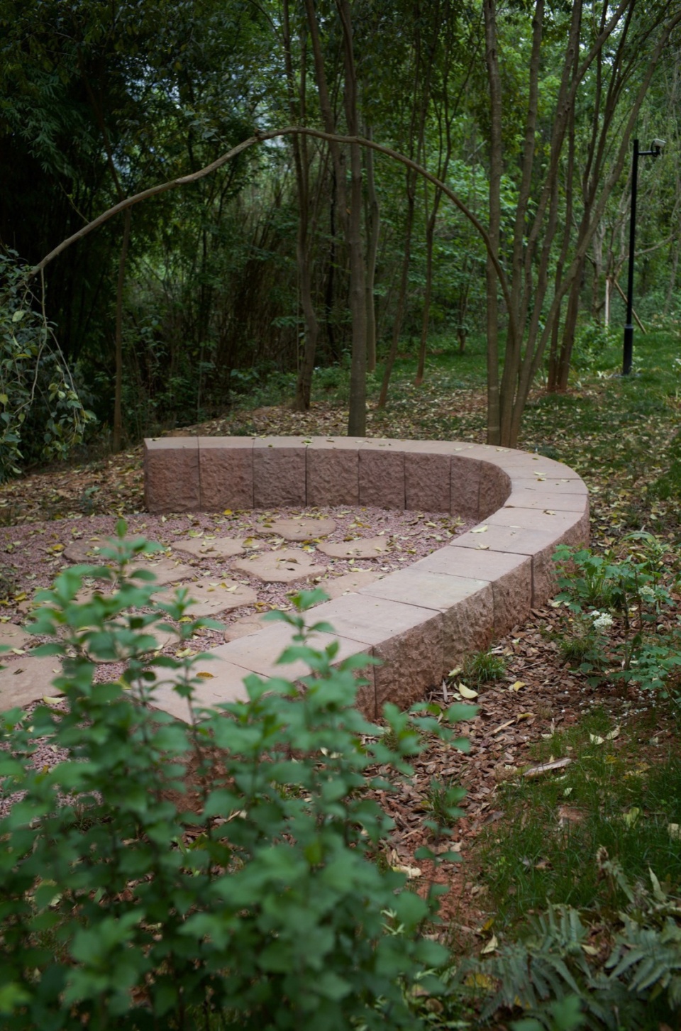 我们使用的材料也并非形式选择,而是出于对山林气息的延续:枕木、红砂岩、整石、原木桩被简洁地安放于林下,它们不强调存在感,而是在地貌与植被之间完成质感的衔接。这种“隐于自然”的设定,是希望整个场地在视觉和体验层面,都不过度强调设计本身,而是让人感受到,它本就该如此。