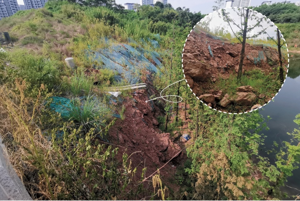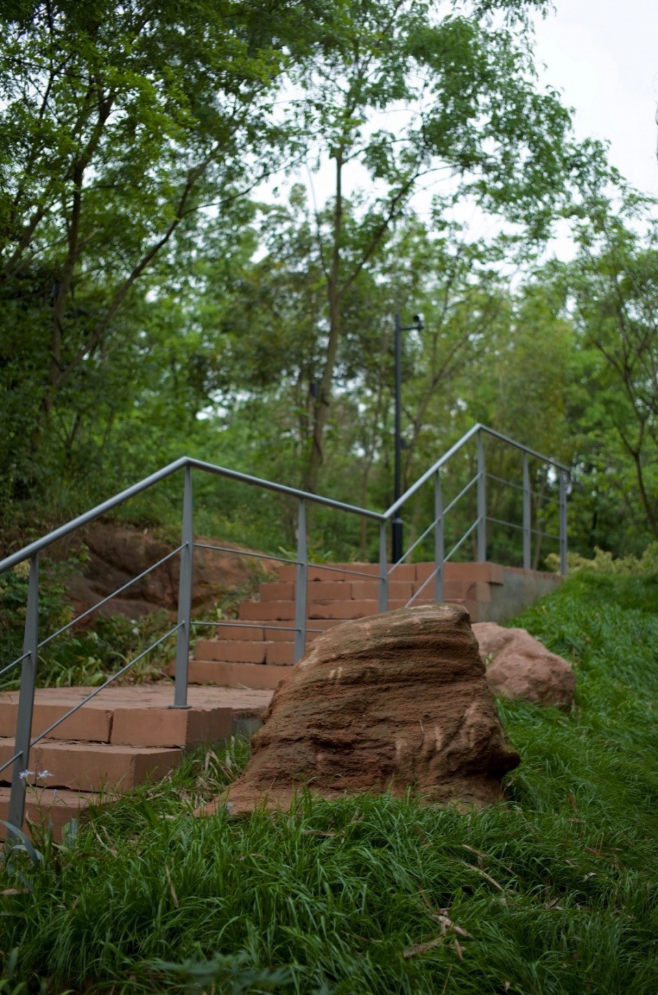 On one side of the lake, the slope was steepened by early excavation, with weathering occurring on the rock surface, and occasional moss naturally growing on the red sandstone walls. While the rock texture is solid and distinctive, the overall environment feels harsh, lacking a seamless connection with the surrounding forest ecosystem.We decided to spray grass seeds, relying on the power of time and nature to gradually green the slope over one to two years, allowing it to slowly blend into the forest.