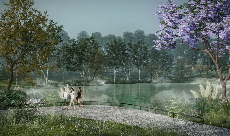 Green Field Park is located in the southern lake district of Luxelakes Eco-City, forming a narrow strip of land covering approximately 70,000 square meters. Serving as a public green space between the Luxelakes Water City and the urban roadway, it borders the Xianzong Park waterway and connects multiple residential clusters.