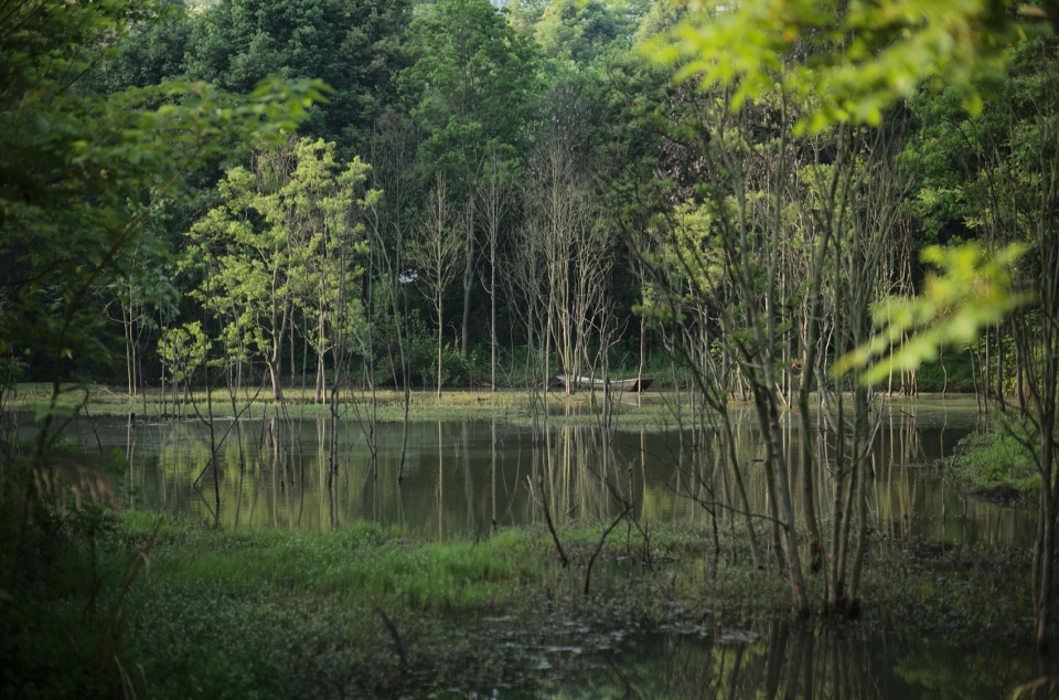 We carefully refined the site’s natural features: clearing water accumulations, gently expanding shallow banks, and adjusting embankments to restore ecological continuity, reconnecting water and forest. Near visitor areas, a wooden boardwalk connects paths, guiding people toward the wetland without disrupting the natural environment. This process brought out the site’s ecological potential, evoking the wild beauty of shallow forest edges typical at the foot of Western Sichuan’s mountains.