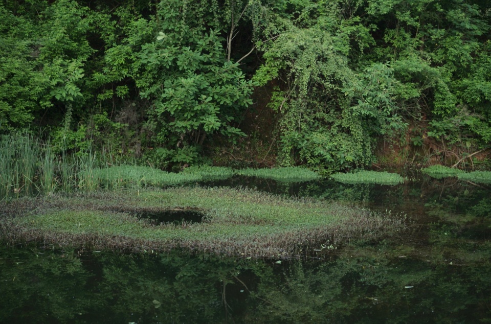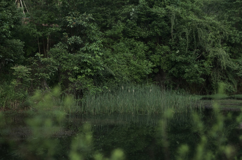 山脚之下,两处静默的水塘令我们印象深刻。水塘不大,却在时间的沉淀中展现出水林交织的独特风貌。岸边和水中分布着茂密粗壮的香樟林及乌桕,水质清澈见底,山脚的边际线隐约可见。底栖生物也很丰富,水鸟、鱼类随处可见。