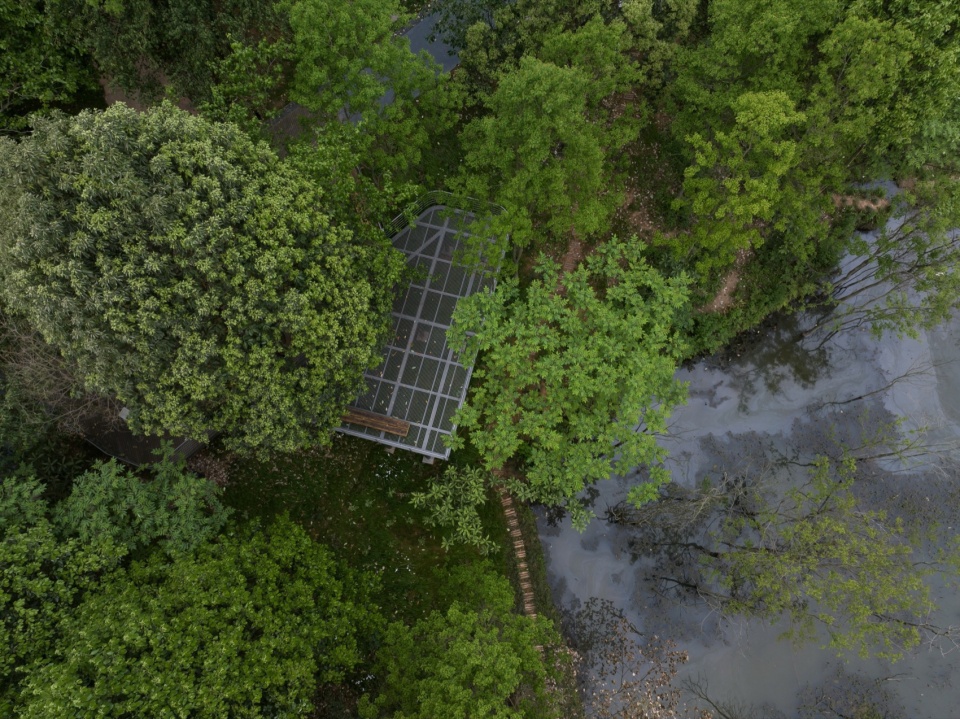 At the edge of the native wetland, the land naturally rises on the back slope, with a flatter interior. The trees grow tall and strong, and the undergrowth is open and clear, making it one of the few expansive areas on the site. Following the slope, we built a suspended platform at the edge with minimal contact, blending it into the forest and slowing the rhythm of movement through it.