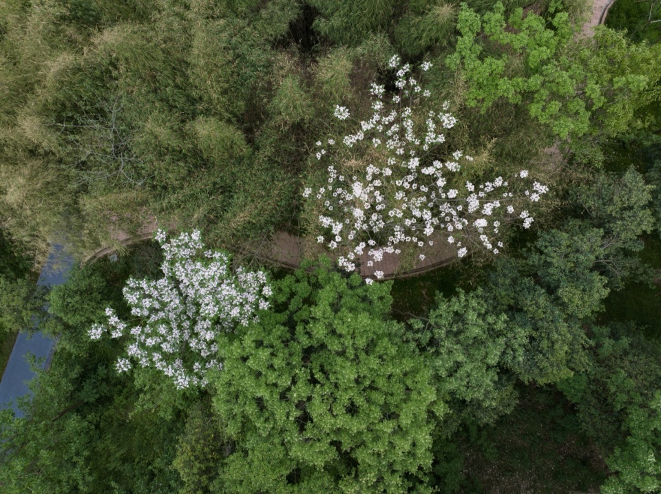这片曾经遭受风雨侵蚀的土地,也夹杂着外来物种的入侵。我们适度疏伐出部分如构树等先锋树种,保留长势良好的植被;对生态和景观价值较低的区域,因地修复、逐步改良。随着季节推移,春有樱如云,秋有乌桕水杉带来斑斓色彩,香樟会四季常青,林下的自然花境也会随之生长演替,在不经意间丰富了地貌肌理,为公园注入源源不断的生命力。