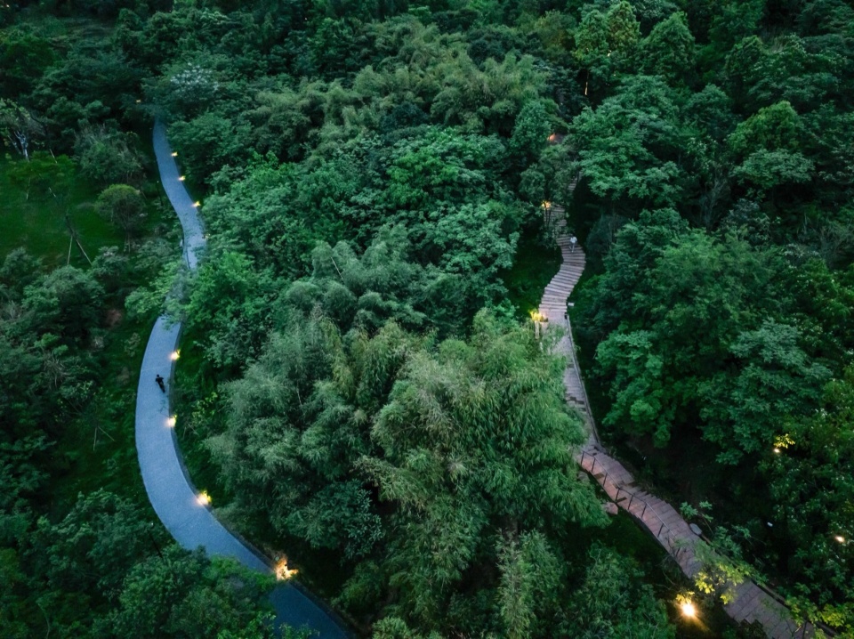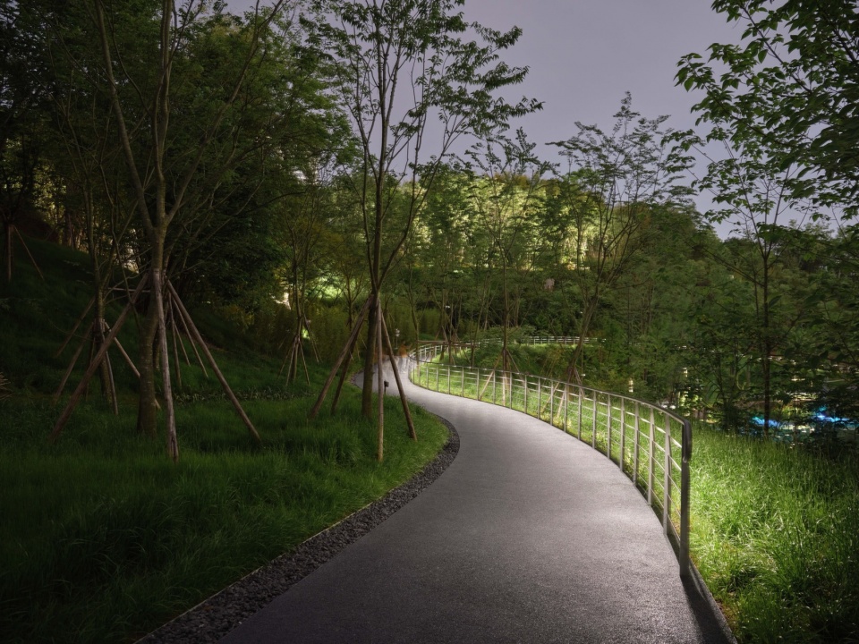 在公园的照明上,我们也始终将生态友好置于优先考量。人流较多的临湖步道采用低位草坪灯,节点处以小型泛光灯柔和补光;登山道上仅设置下照式庭院灯,满足人行的基础照明需求,泛光控制于少量关键区域;密林深处则不再设照明。同时,在人流低谷时段,部分光源将自动关闭,减少对野生动物活动节律的干扰。