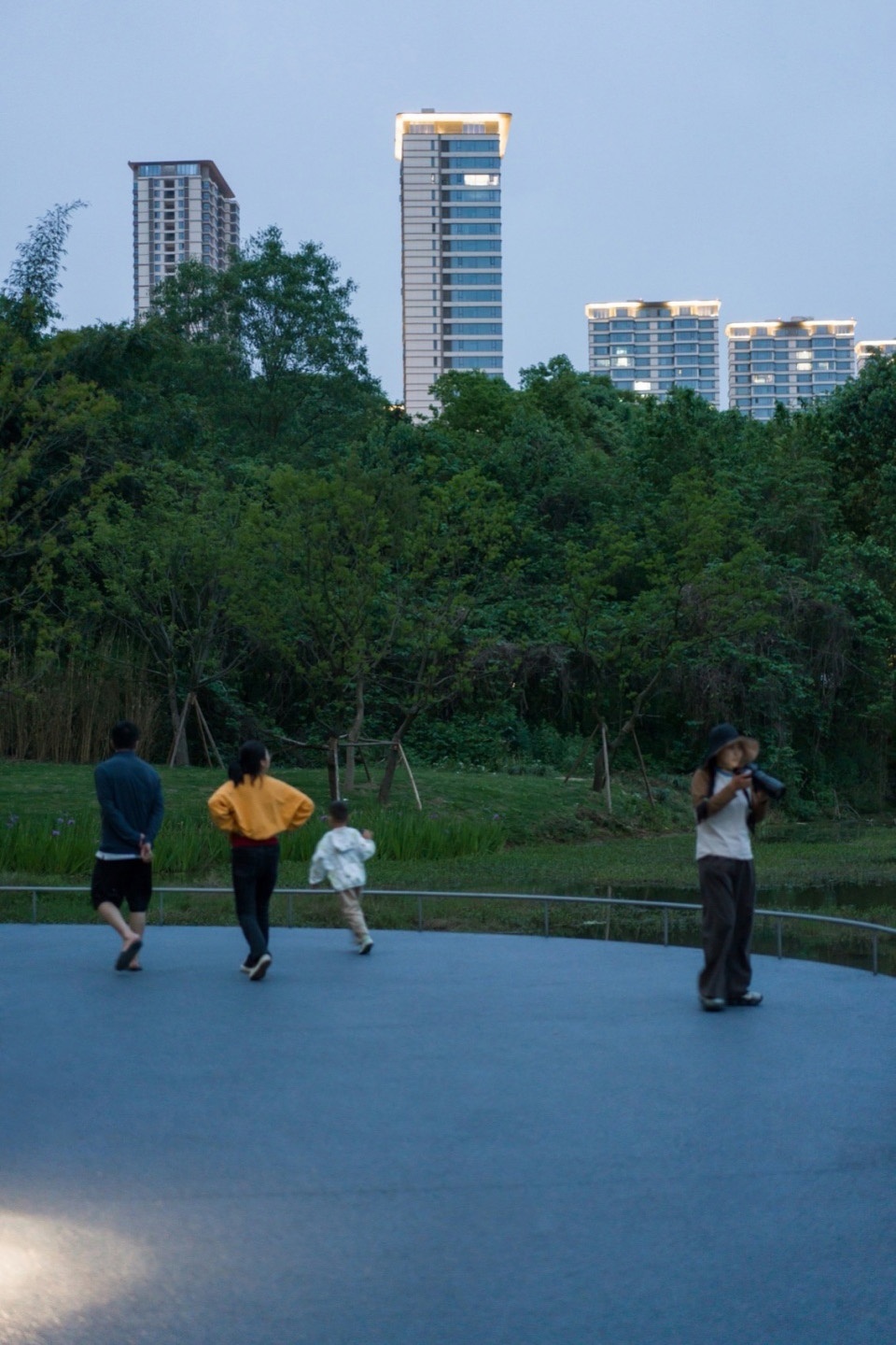 更开阔的自然接触区中,地势起伏和山谷相续,空间愈加松弛自由,孩子在草地上奔跑、老人沿着缓坡散步、三五邻人随地而坐。公园不再只是单向服务场所,而是逐渐融入周边居民的日常轨迹,成为了人们生活的一部分。
