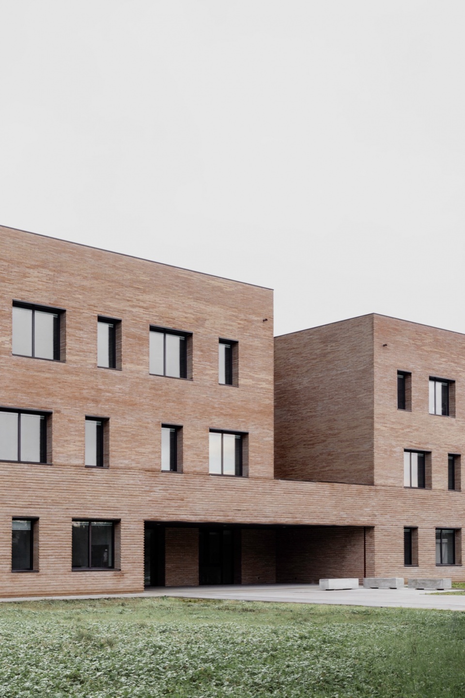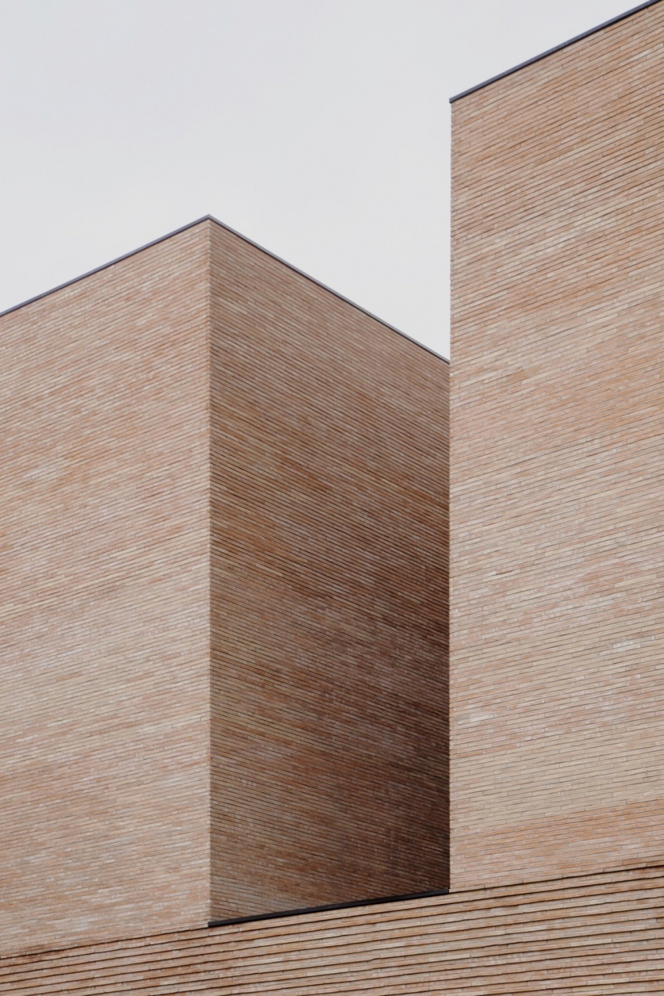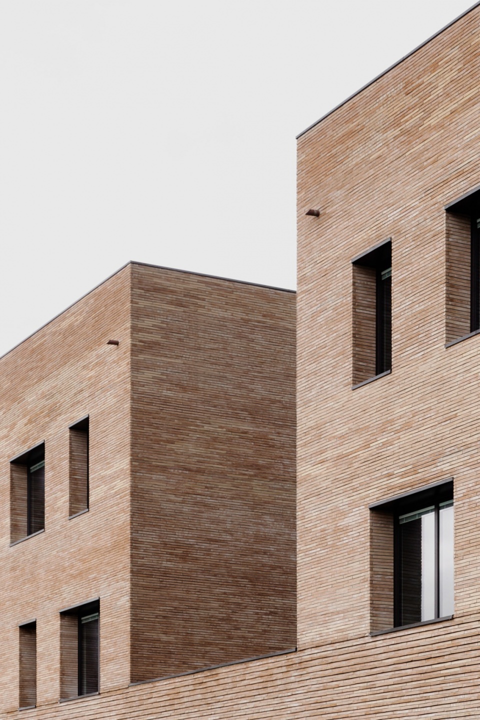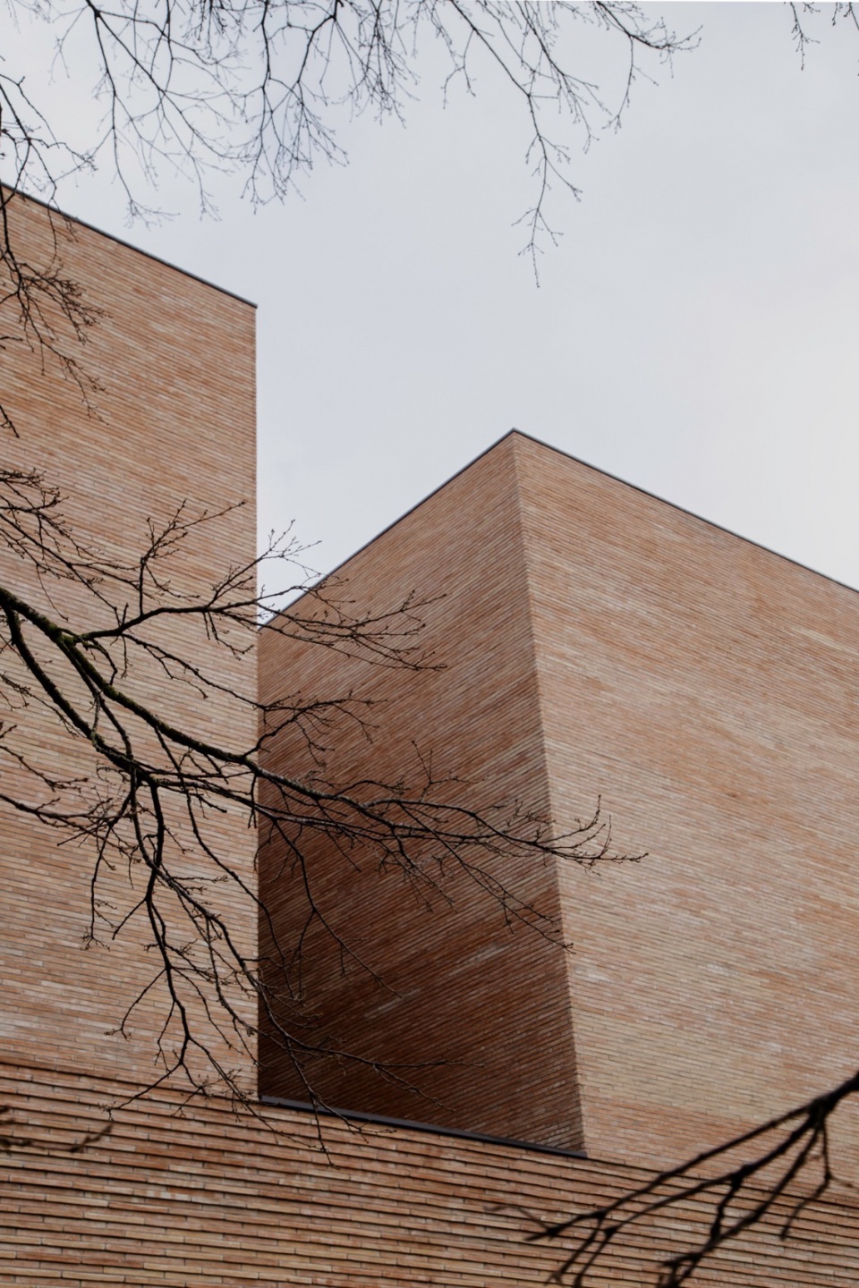 材料的选择亦是项目的关键之一。砖的运用源于设计团队希望与周边环境建立联系的愿望。砖作为一种连续且富有触感的元素,强化了建筑体量构成的表达,将平面布局上的变化清晰地转化为立体上的起伏。尽管建筑本身体量感强,但由于砖材具有手工质感——每块砖都独一无二、略有差异,整体呈现出生动丰富的细节层次。这种做法使建筑从远处看去显得厚重而整体,近观则可感受到其不规则表面所带来的光影与材质变化,增强了建筑的动态气质。