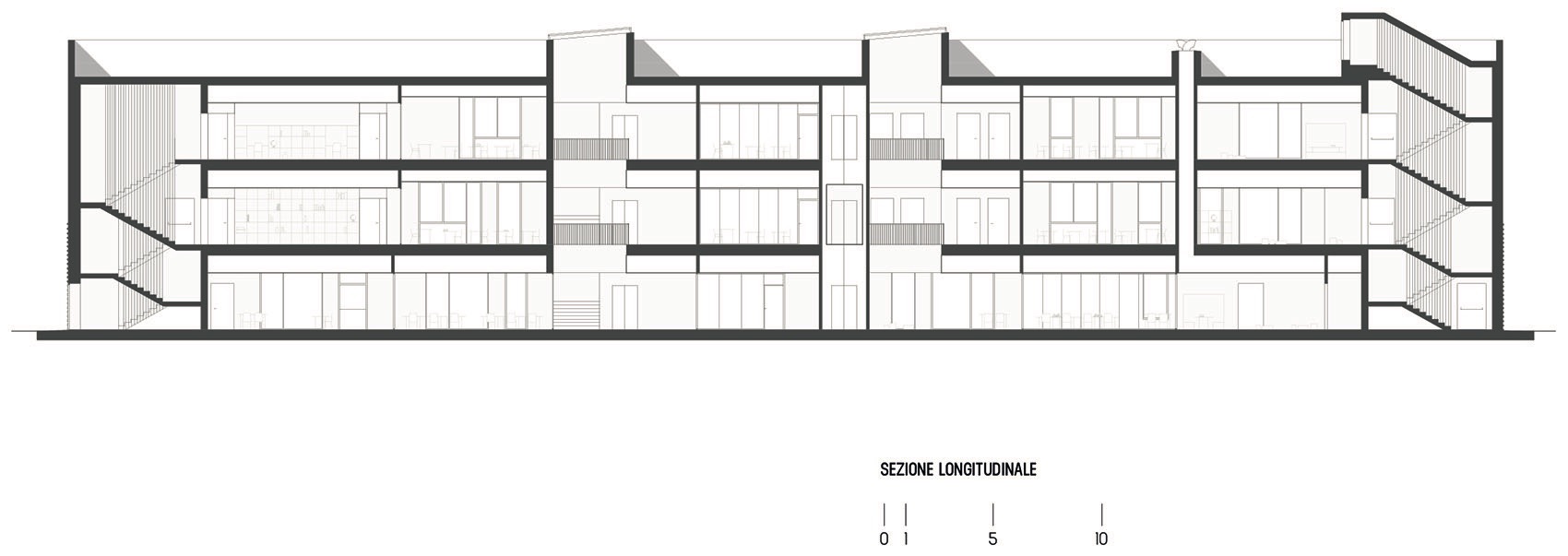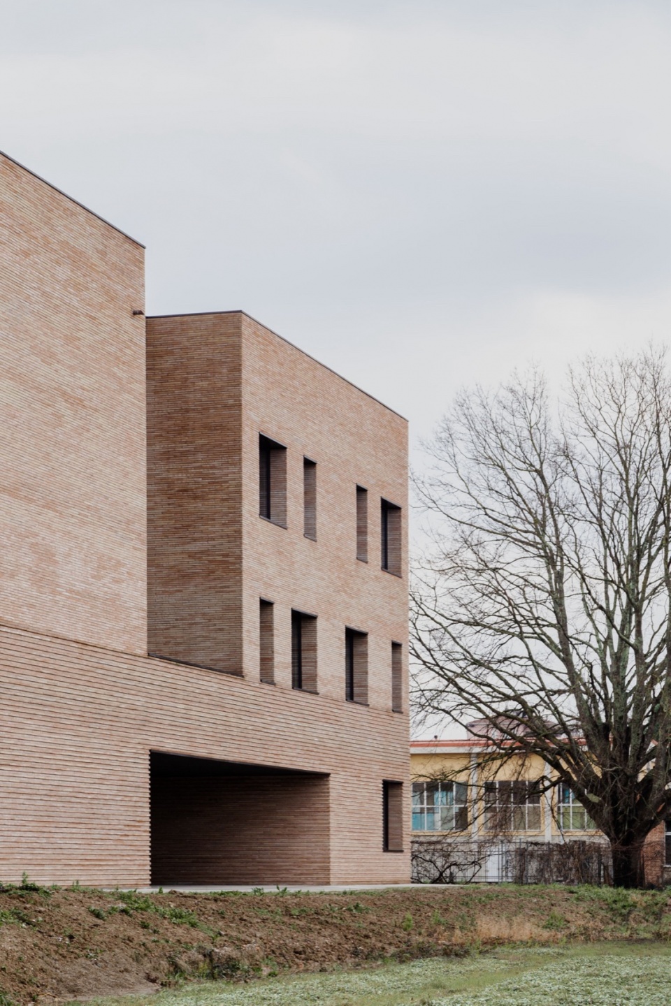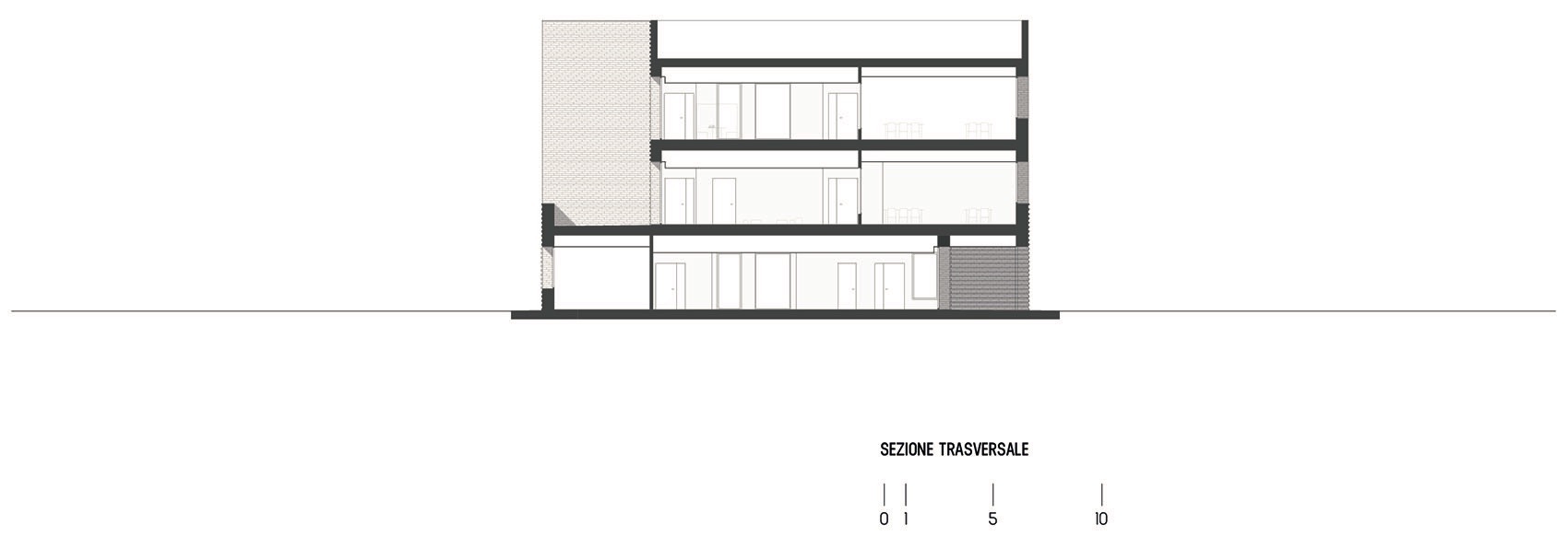 Another fundamental aspect is materiality. The choice of brick was driven by the desire to establish a connection with the surrounding context. As a continuous and highly tactile element, brick emphasizes the volumetric composition of the building, clearly translating floor plan variations into volumetric changes. Although the building’s mass is substantial, the use of brick lightens its perception due to its artisanal nature: each unit is unique and different from the others, generating a vibrant variety of details. From a distance, the building appears solid and compact, while up close, it reveals its irregularities, creating a play of shadows and surfaces that enhances its dynamic character.