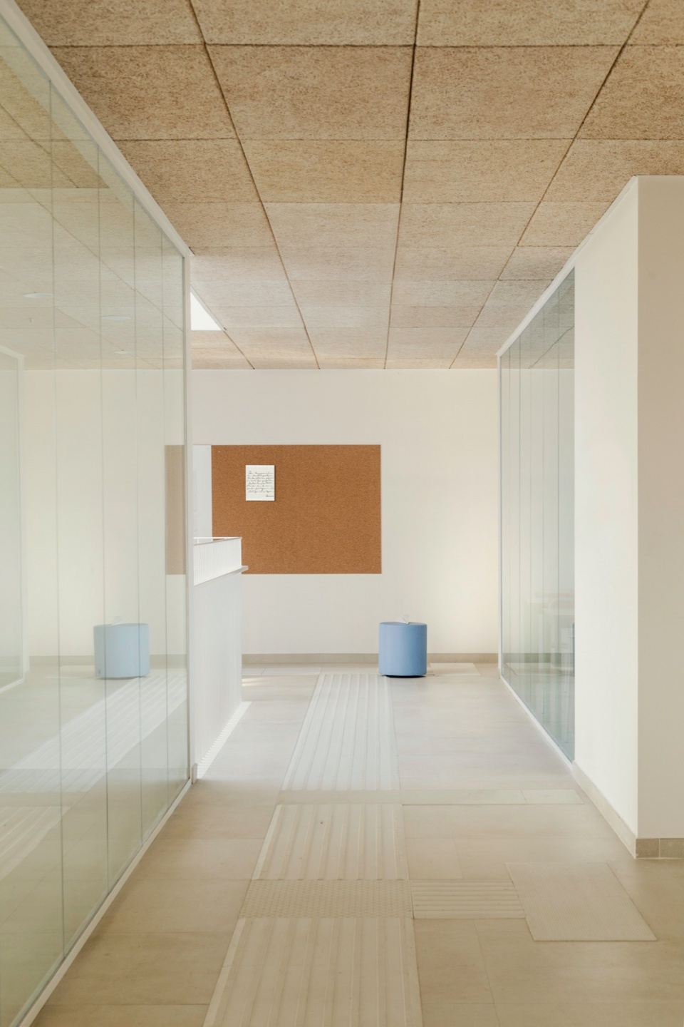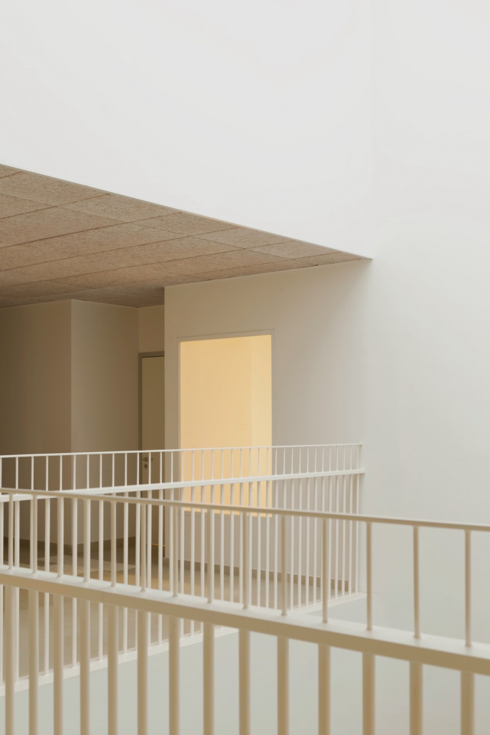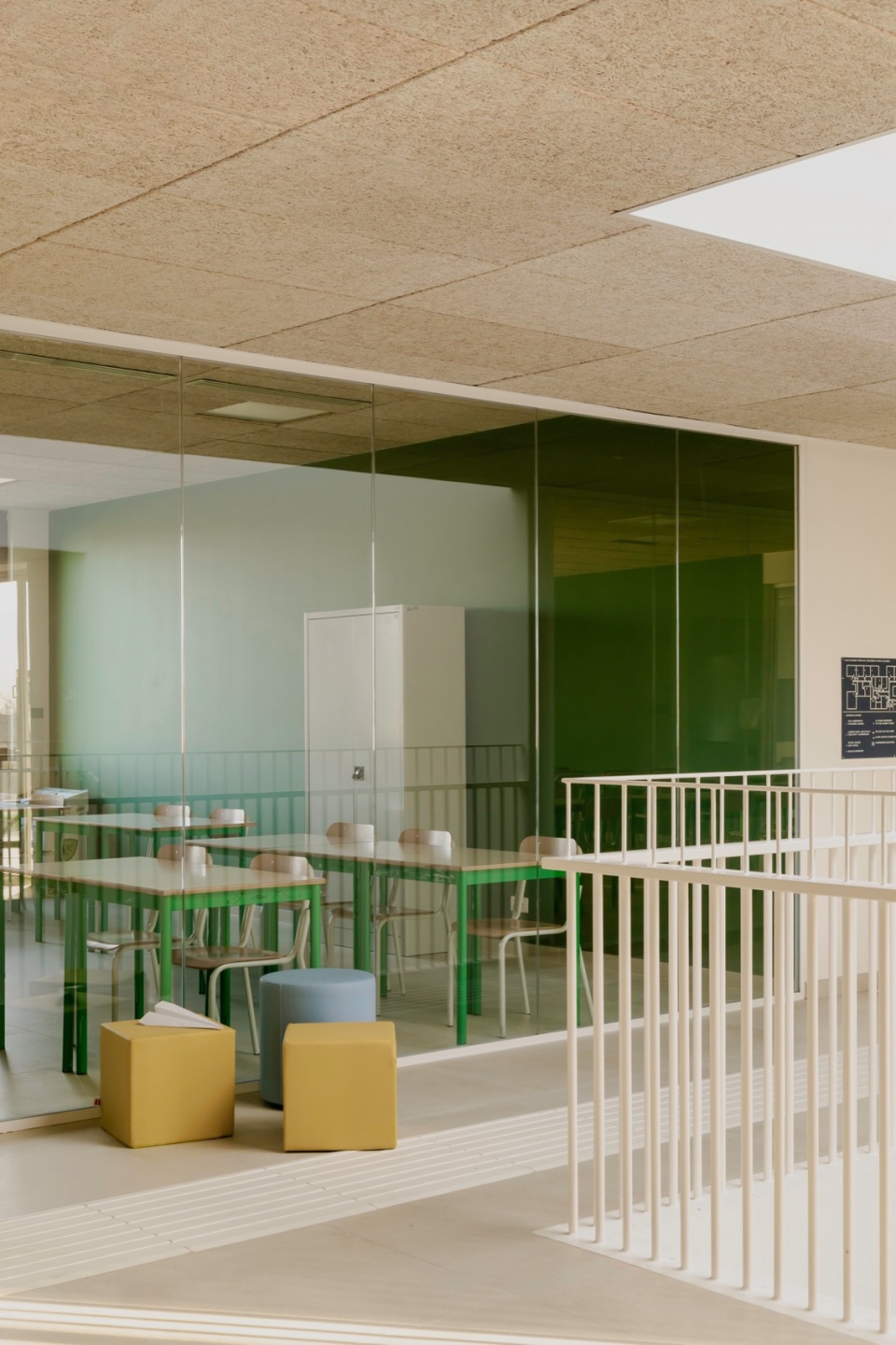 除了“聚落”理念,项目的另一关键要素是贯穿整栋建筑的一条富有层次的路径。它并非按传统路径笔直延伸,而是以更流动和富有变化的方式展开,引导学生在空间中不断探索与发现。沿一条理想轴线布置的玻璃体量构建出视觉连通性,激发好奇心与行动力。学生在行走中,目光能不时捕捉到其他空间正在发生的活动,从而增强空间的开放感与联系感。通过这种方式,原本理想中的“长方体”建筑被转化为由体块与空隙组成的空间构成,其中“空”空间亦成为重要的关系场所——学生可以在这里驻足、互动、在课堂之外进行学习。