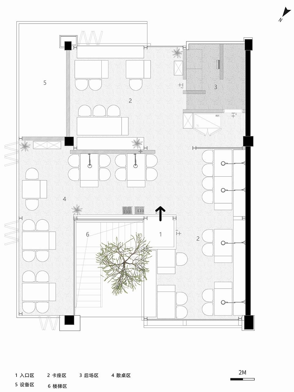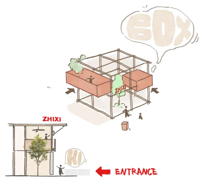 Next, let’s start our exploration from the entrance, Experiencing Nature within the Architecture. To break the enclosed state of the building, an entrance has been opened, and a tree has been placed to create an inviting transitional area, which shortens the distance between people and the building and enlivens the facade.