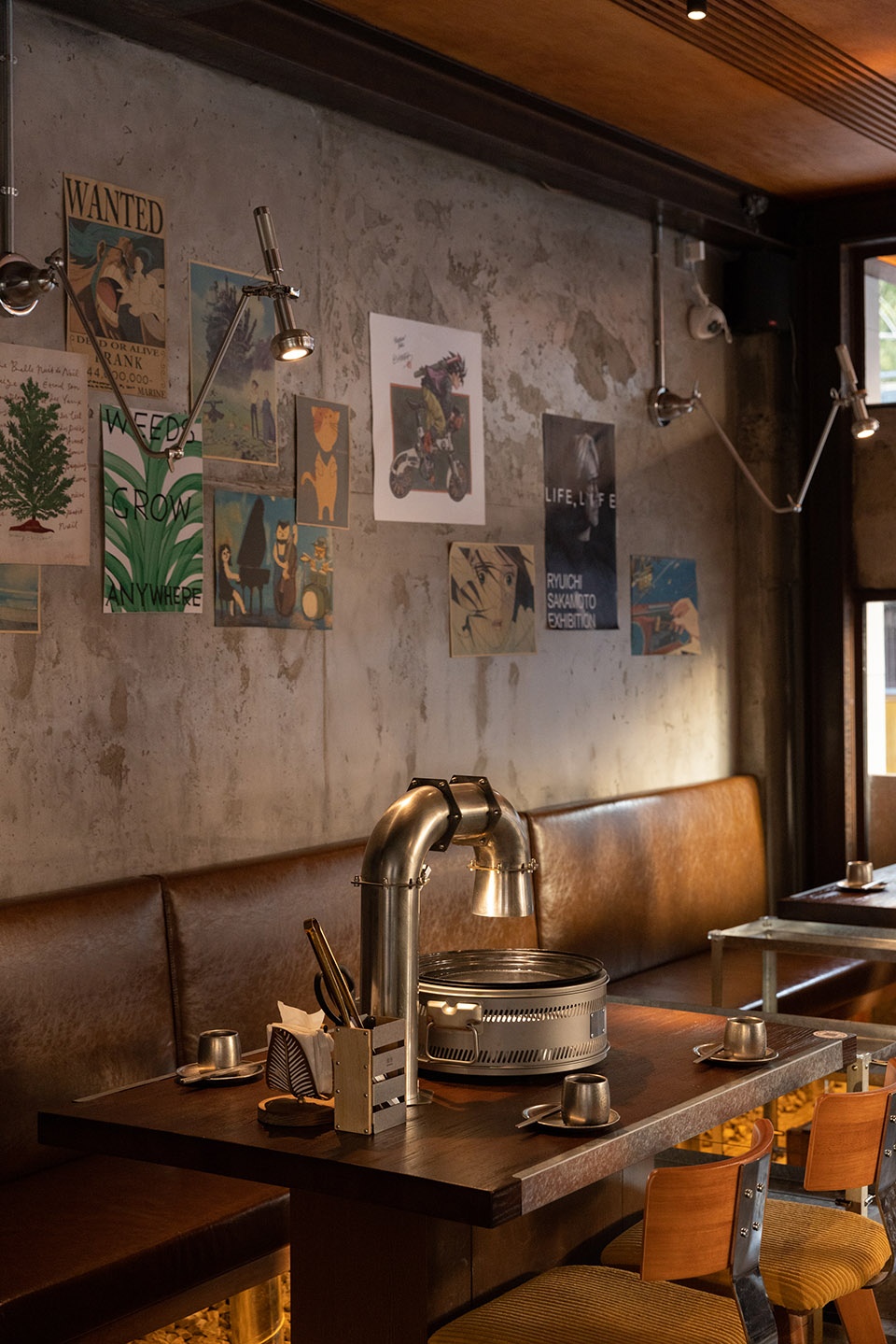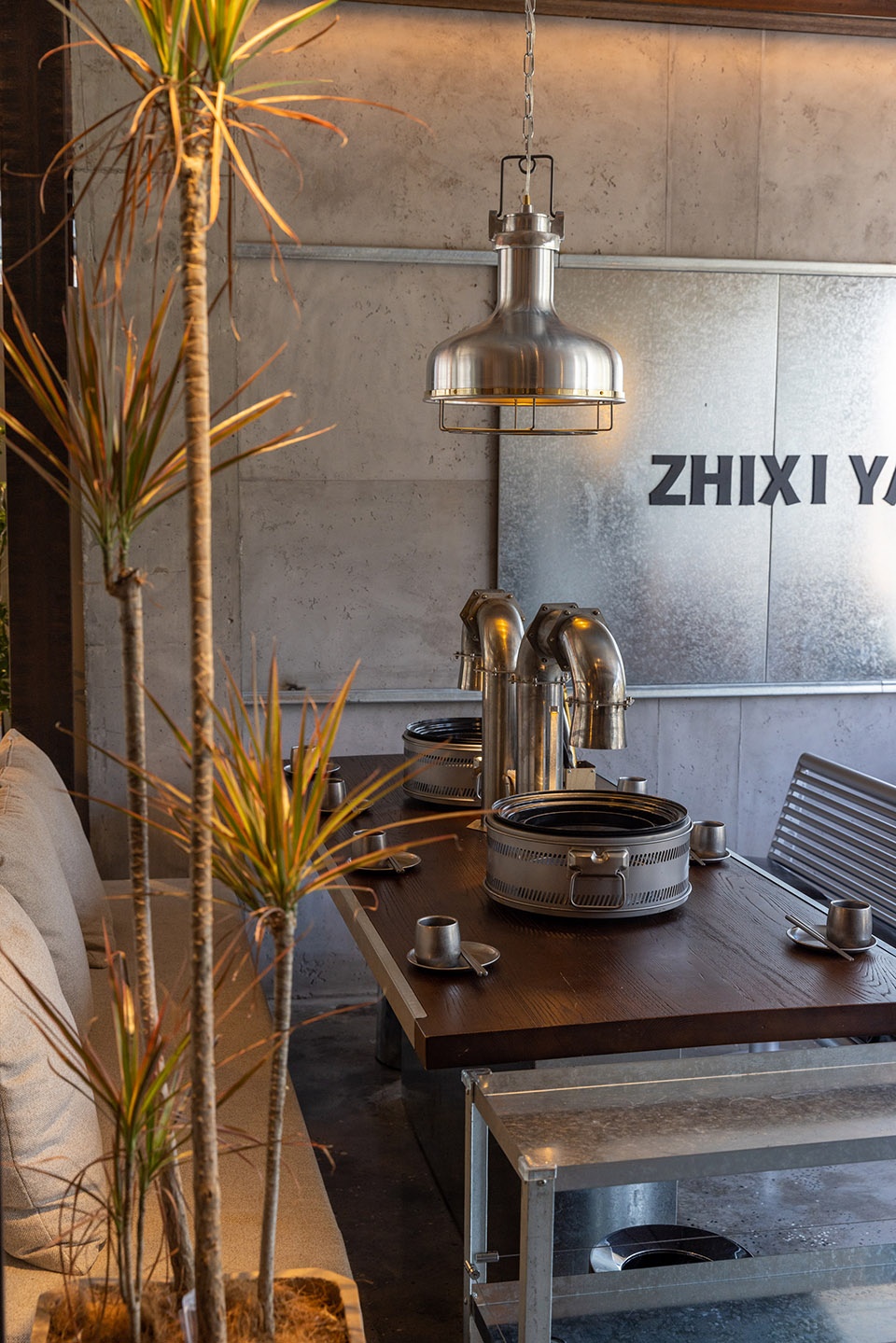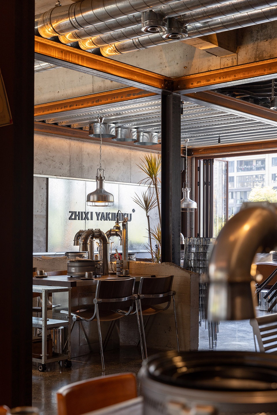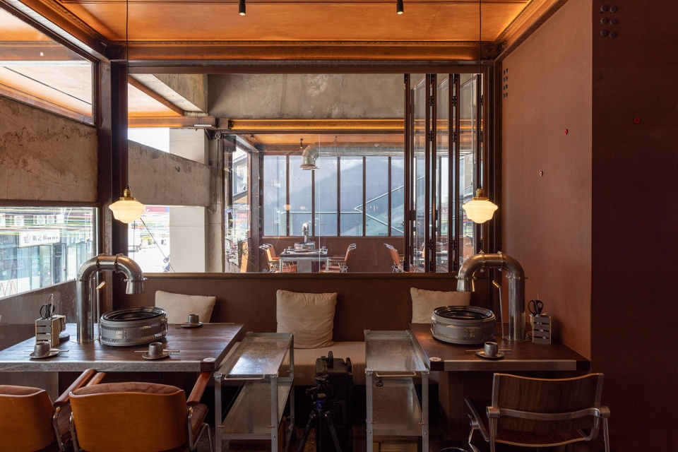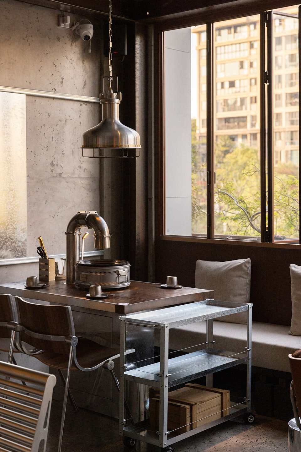 u型钢材立于餐桌,与机械感的金属夹片灯相接,与桌面烤盘、做旧烟管视觉统一。