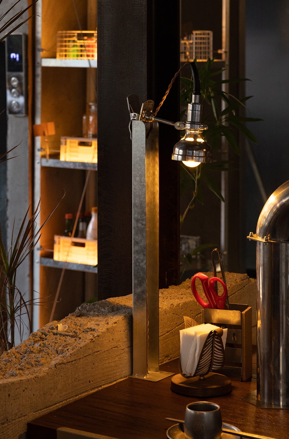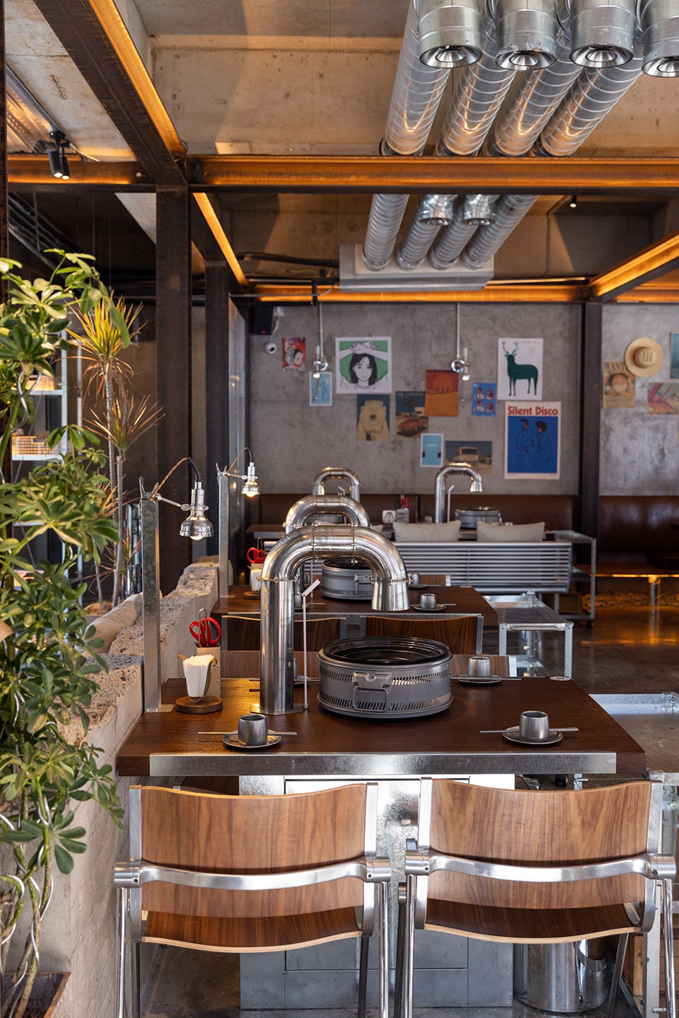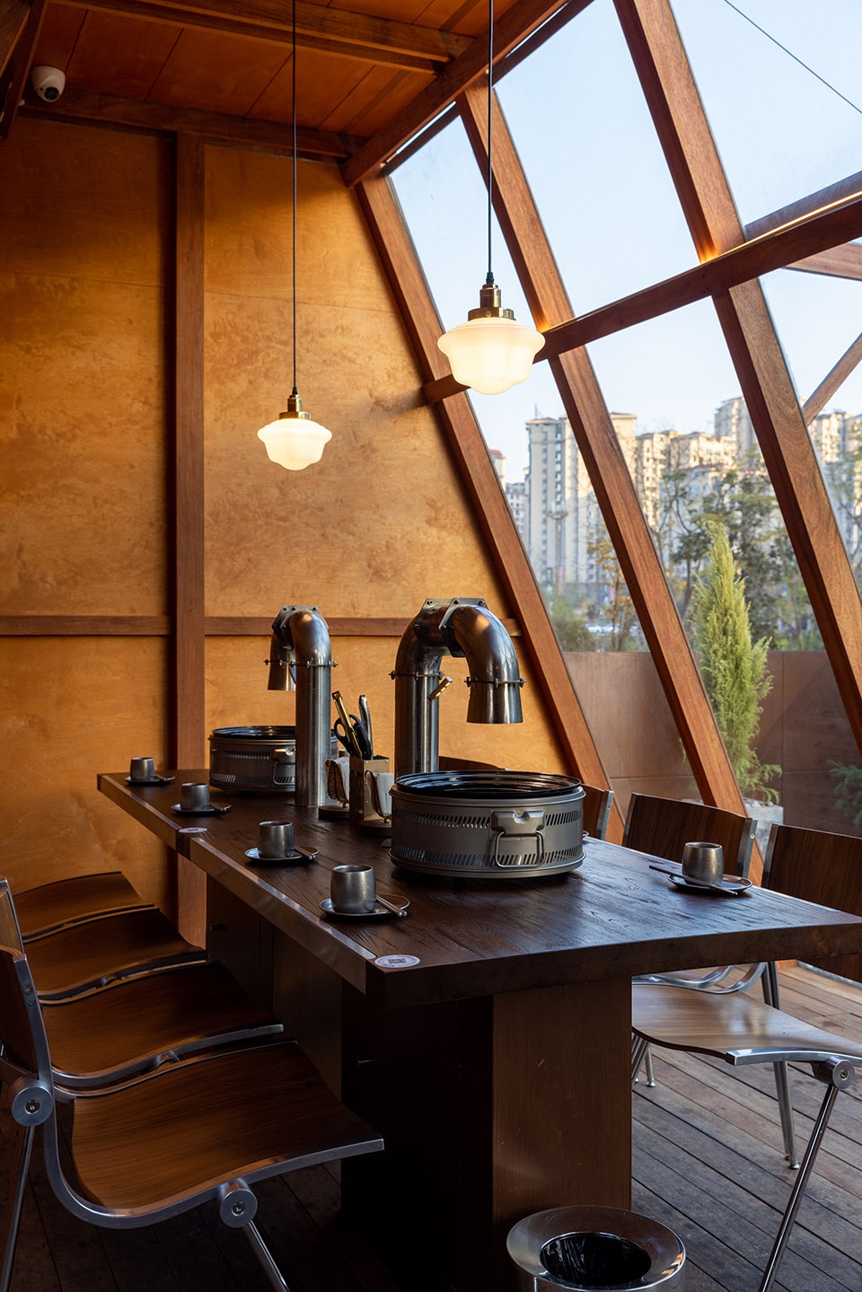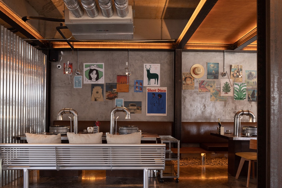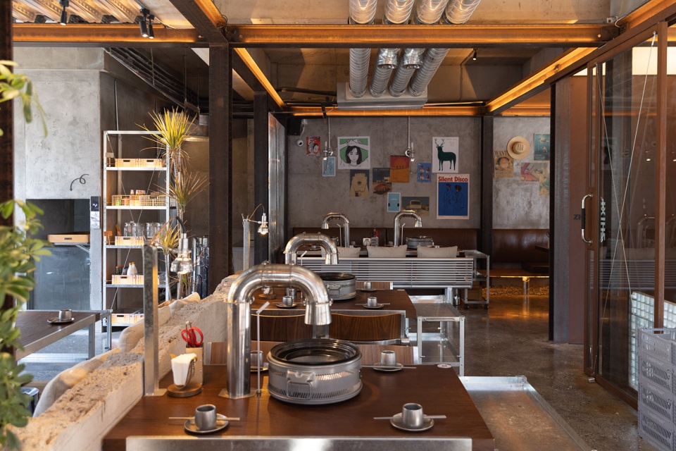 u型钢材立于餐桌,与机械感的金属夹片灯相接,与桌面烤盘、做旧烟管视觉统一。