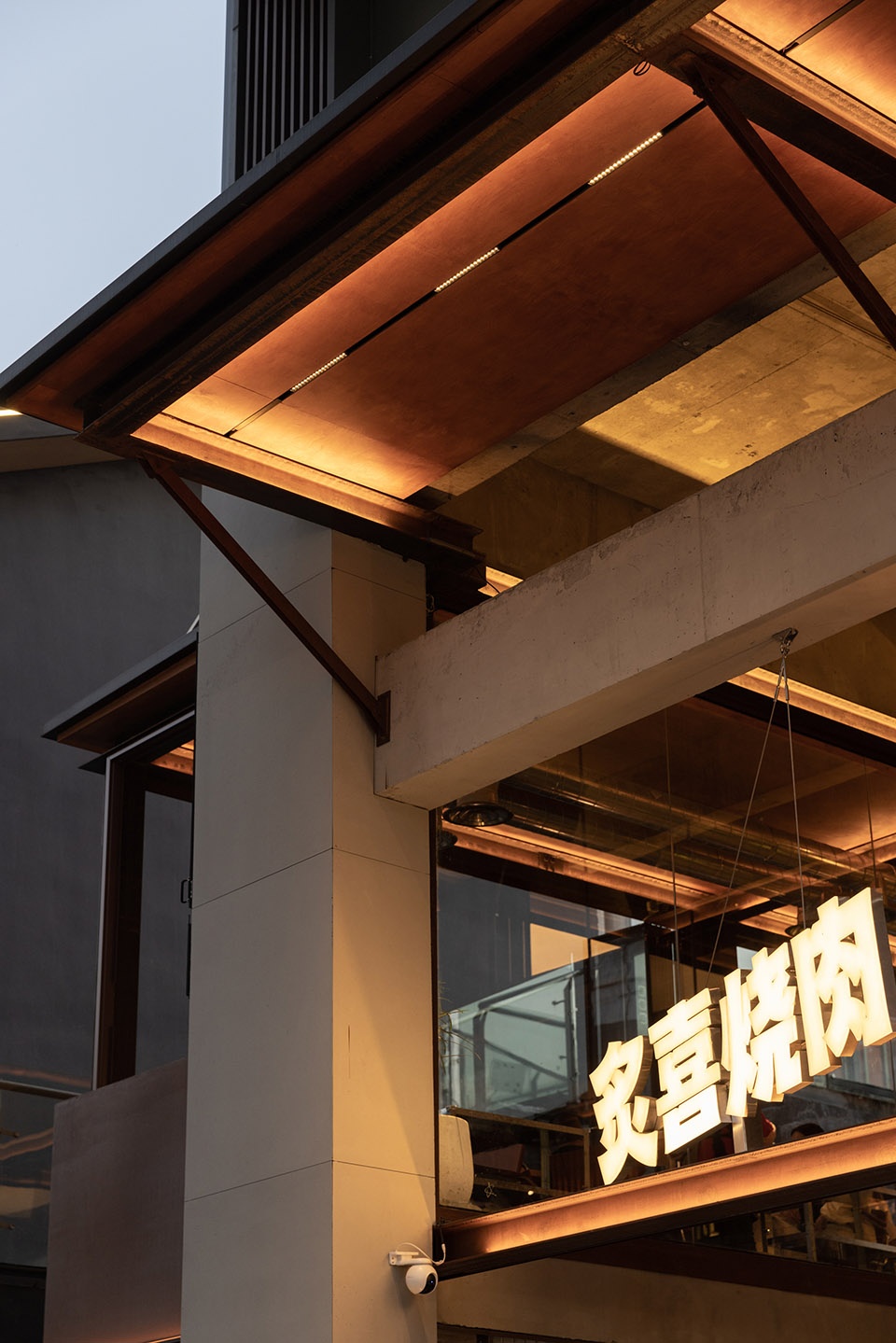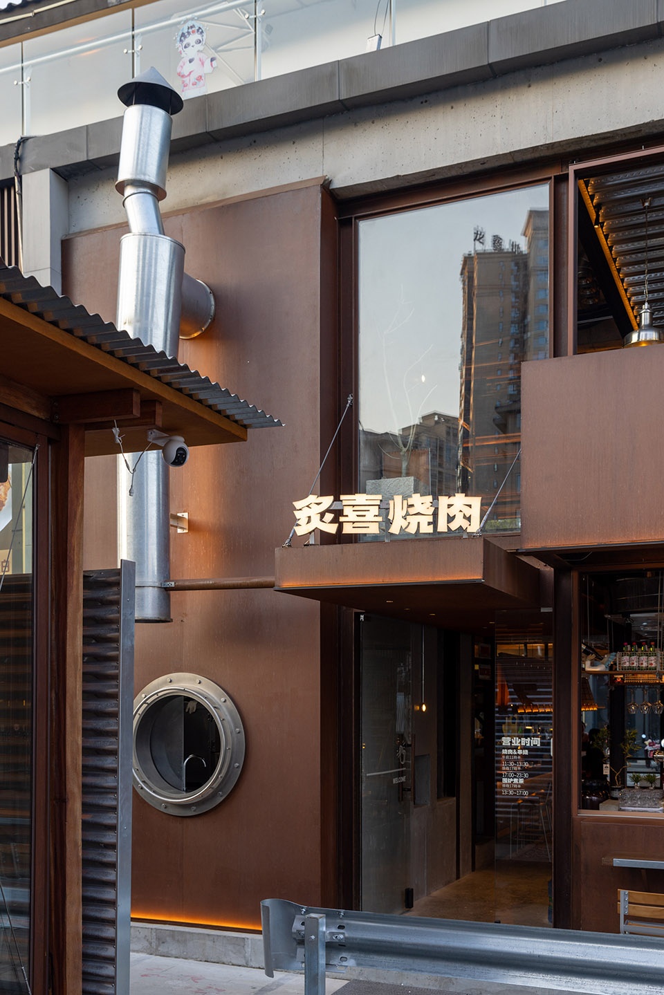 白天接受阳光的照射,晚上被暖黄的灯光映着,在街上成为一道风景线,呈现出轻松舒适的烧肉氛围。