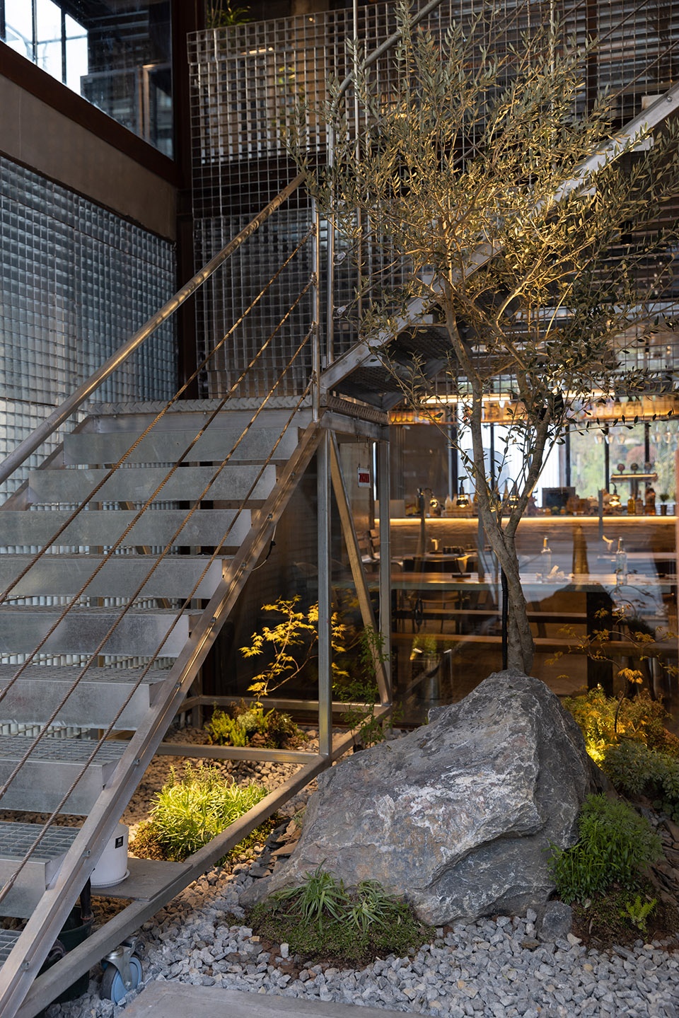Upon closer inspection, the staircase has a flat surface paved with a metal mesh structure. The hooks are diagonally connected with steel wire ropes attached under the handrails, creating a light and ingenious design. The landscape features under the staircase make the entrance more natural, and the olive tree in the middle extends the greenery upwards, brimming with vitality.