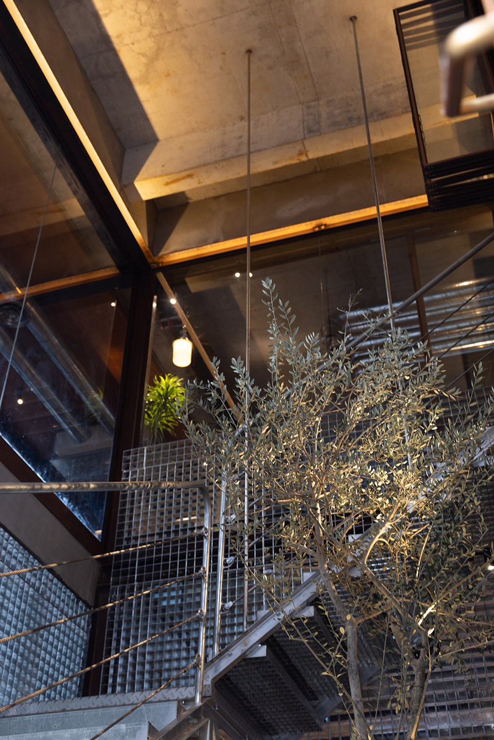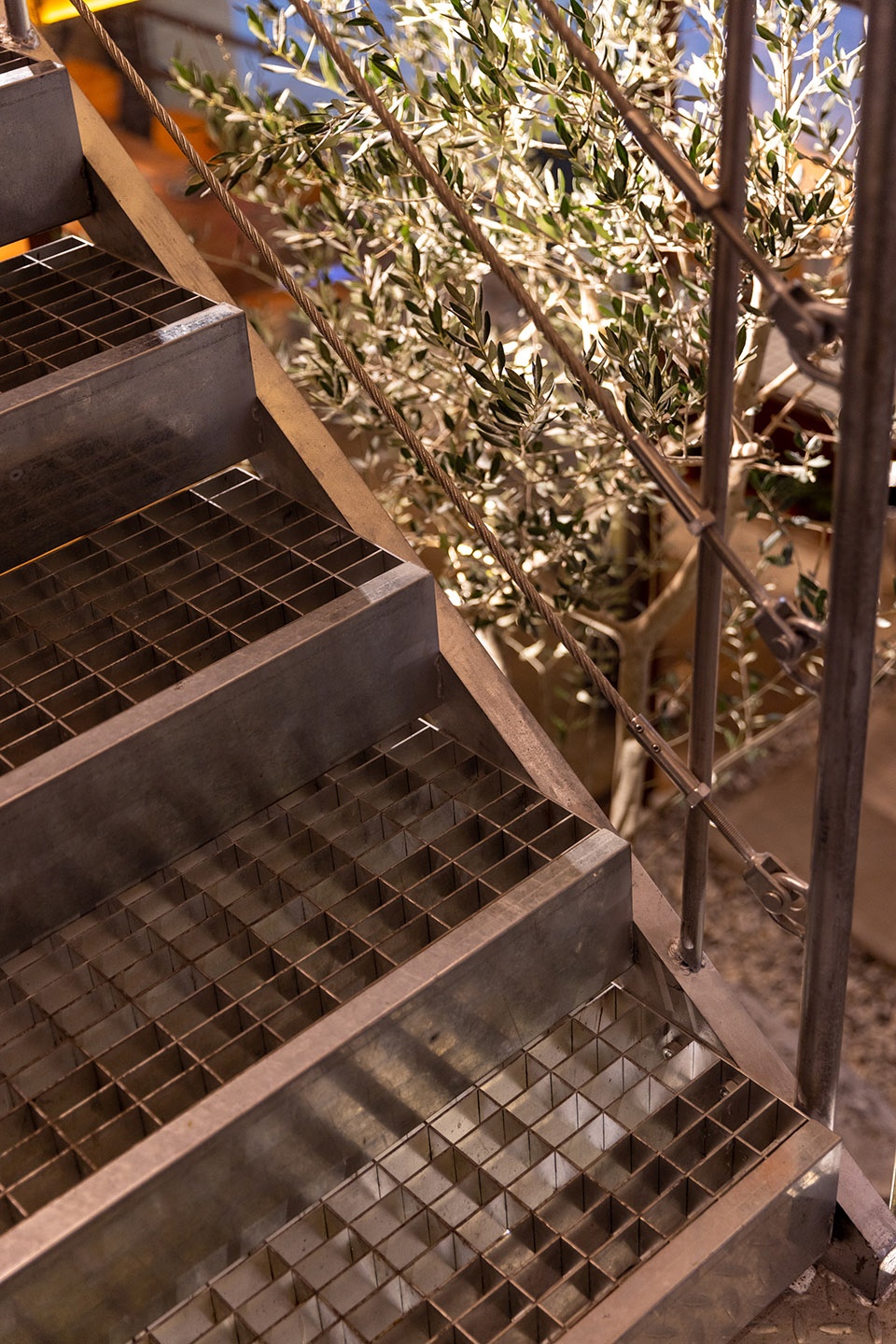 细看楼梯,以金属网结构铺设平面,吊钩斜拉钢丝绳索攀附于扶手之下,轻透巧妙。楼梯下的景观小品使入口处更加自然,中间的橄榄树将绿色向上延申,具有生命力。