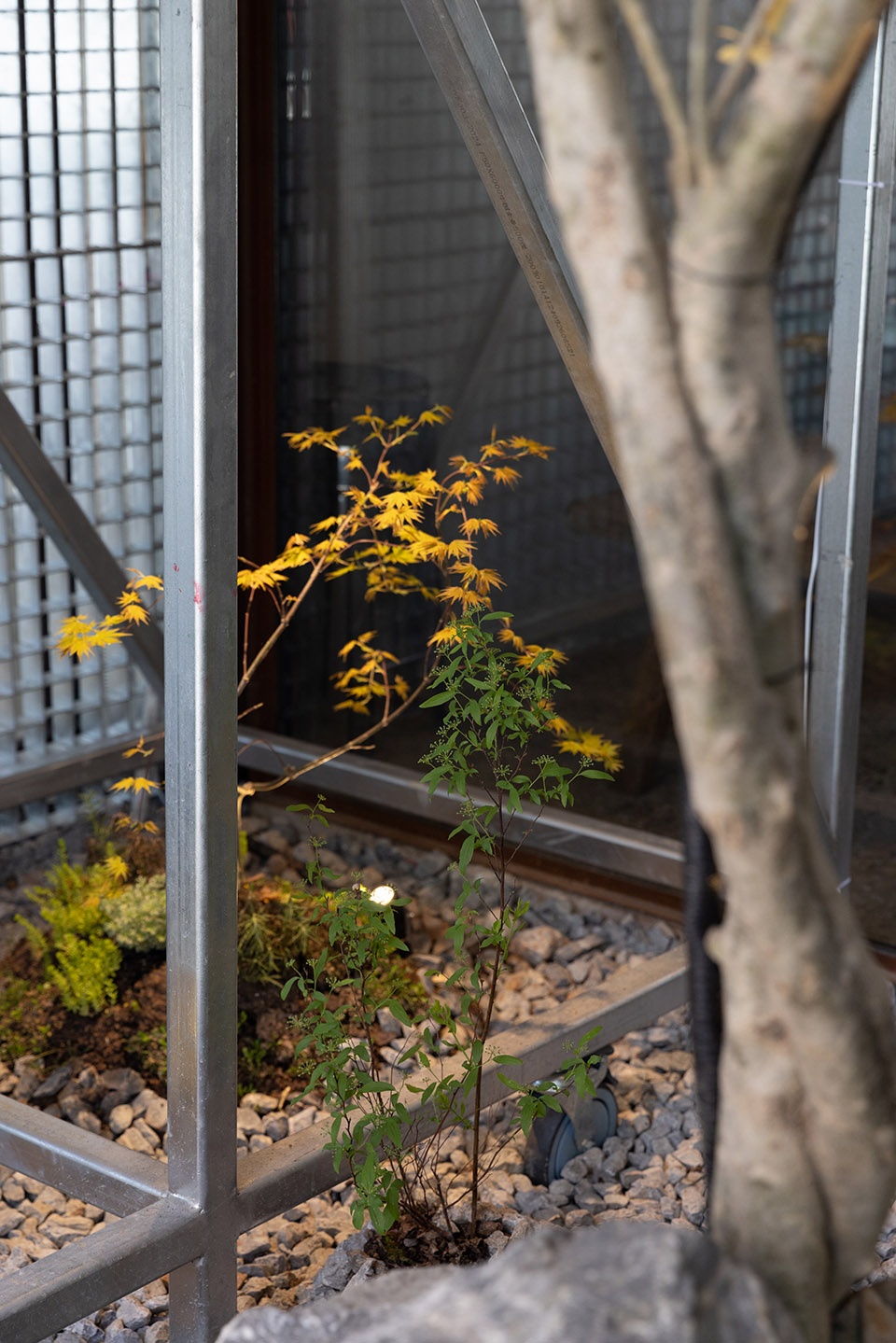 A staircase has been built around the tree, connecting the upper and lower floors. Taking advantage of the building’s height, it enriches the spatial hierarchy. The small-sized steel elements echo the structural language of the overall building.