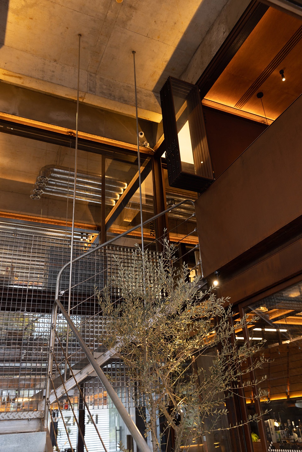 绕树建梯,打通上下层,借助建筑空高,丰富空间层次,同样的小型钢材呼应整体建筑的结构语言。