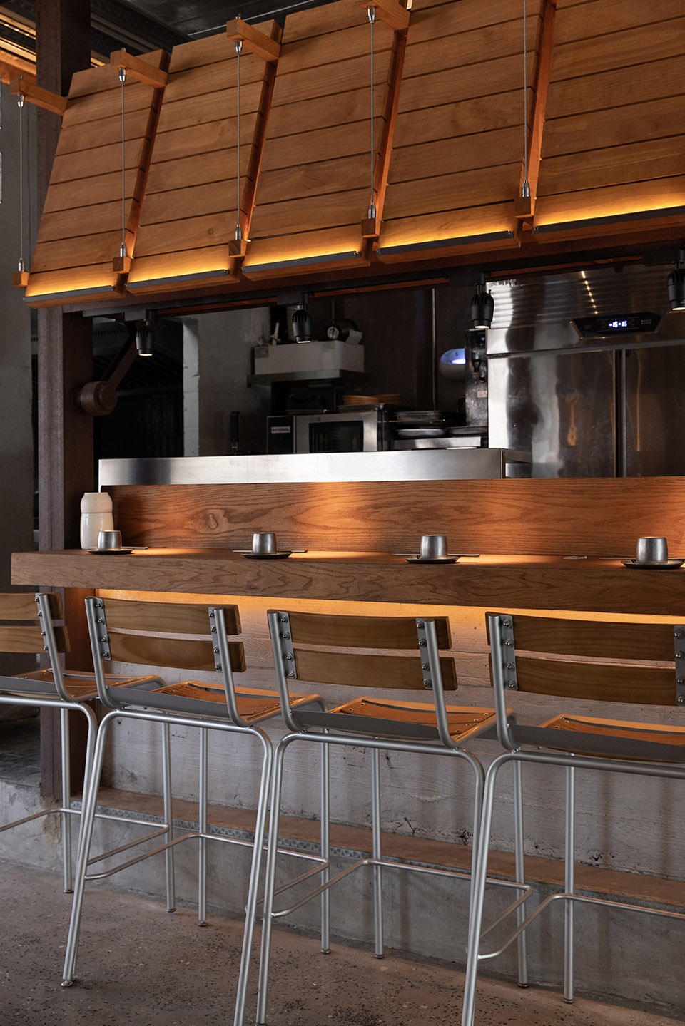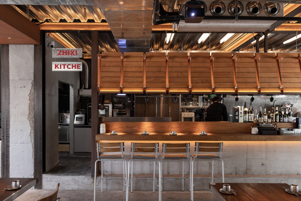 In the dining area on the first floor, a cast-in-place bar dominates the space. Continuing the client’s idea of using wooden structures, wooden planks are stacked layer by layer, and metal components are connected up and down. The light and shadow form surface lighting, generating a sense of order. The metal corrugated panels make the ceiling sparkle under the illumination of the lights, and the warm light on the wooden tabletop is in line with the ambiance of the restaurant.