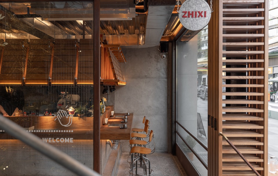 Two wooden small houses of the outdoor seating area are integrated into the scene. Using the expressway guardrails as the enclosure lines, the facade is made of metal corrugated panels, and the interior is paved with wooden floors. The wooden structure and the decorative panels complement each other, with clear textures.