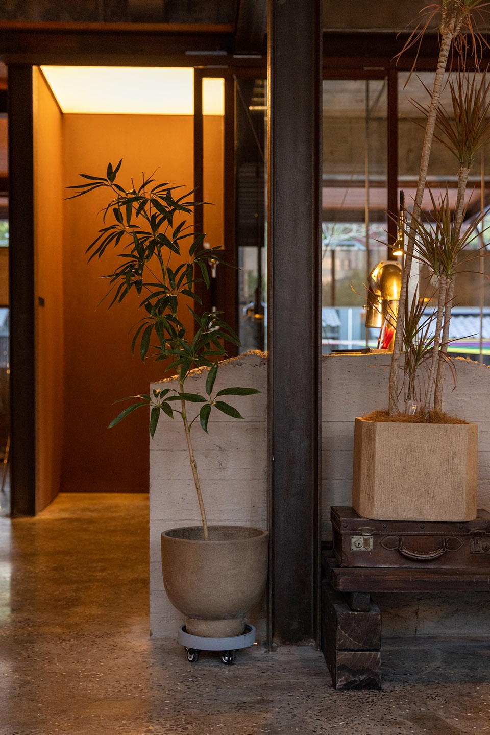 二楼入口以体块灯膜聚焦,唯一的发光面光,指引顾客进出,室内结合工业风灯光,强化蒸汽朋克视觉冲击,绿植点缀平衡硬朗氛围。