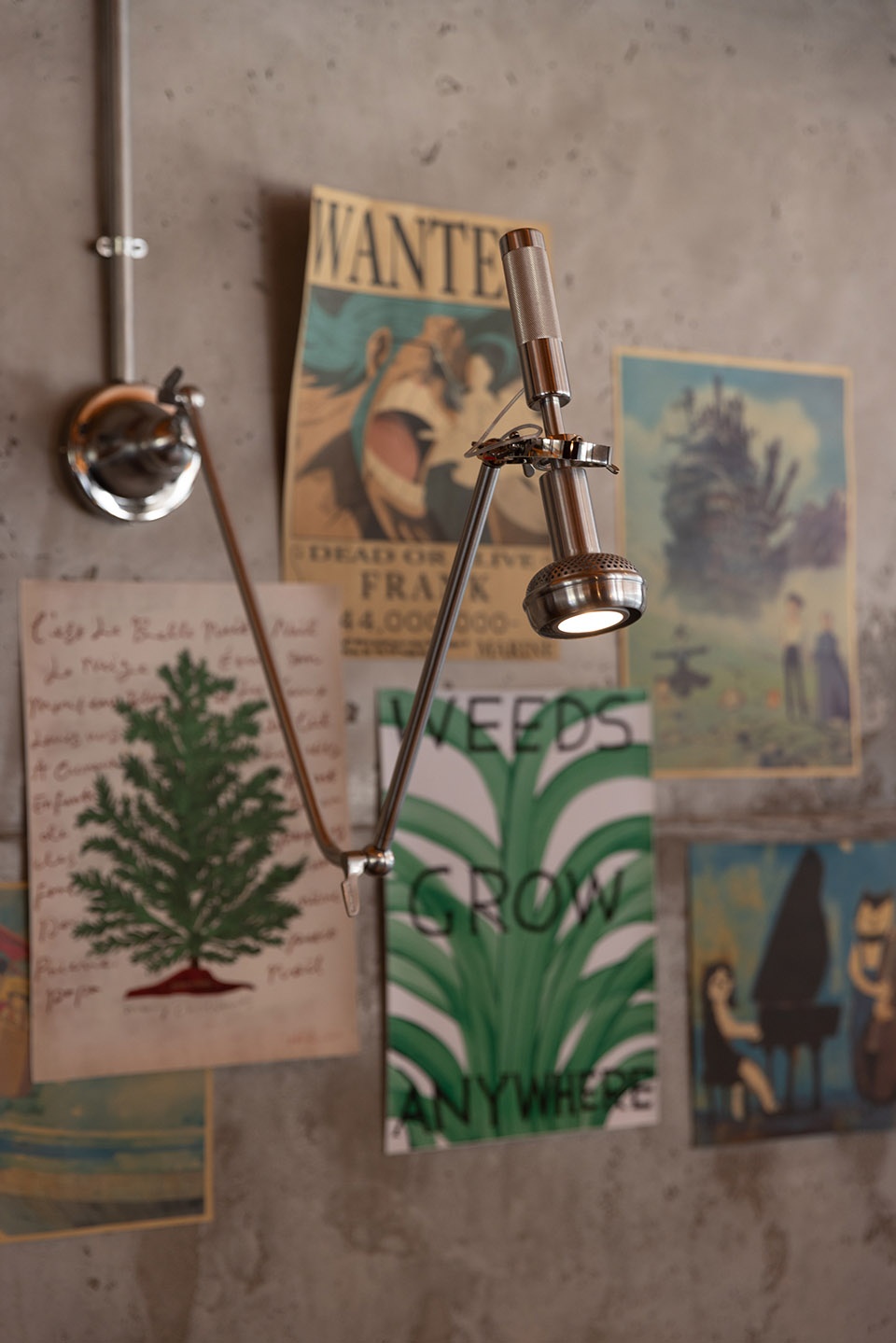 U-shaped steel stands on the dining table and is connected to the mechanically styled metal clip lights, achieving visual unity with the tabletop baking trays and weathered smoke pipes.