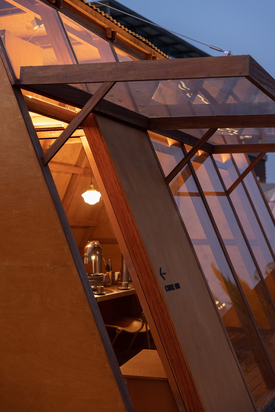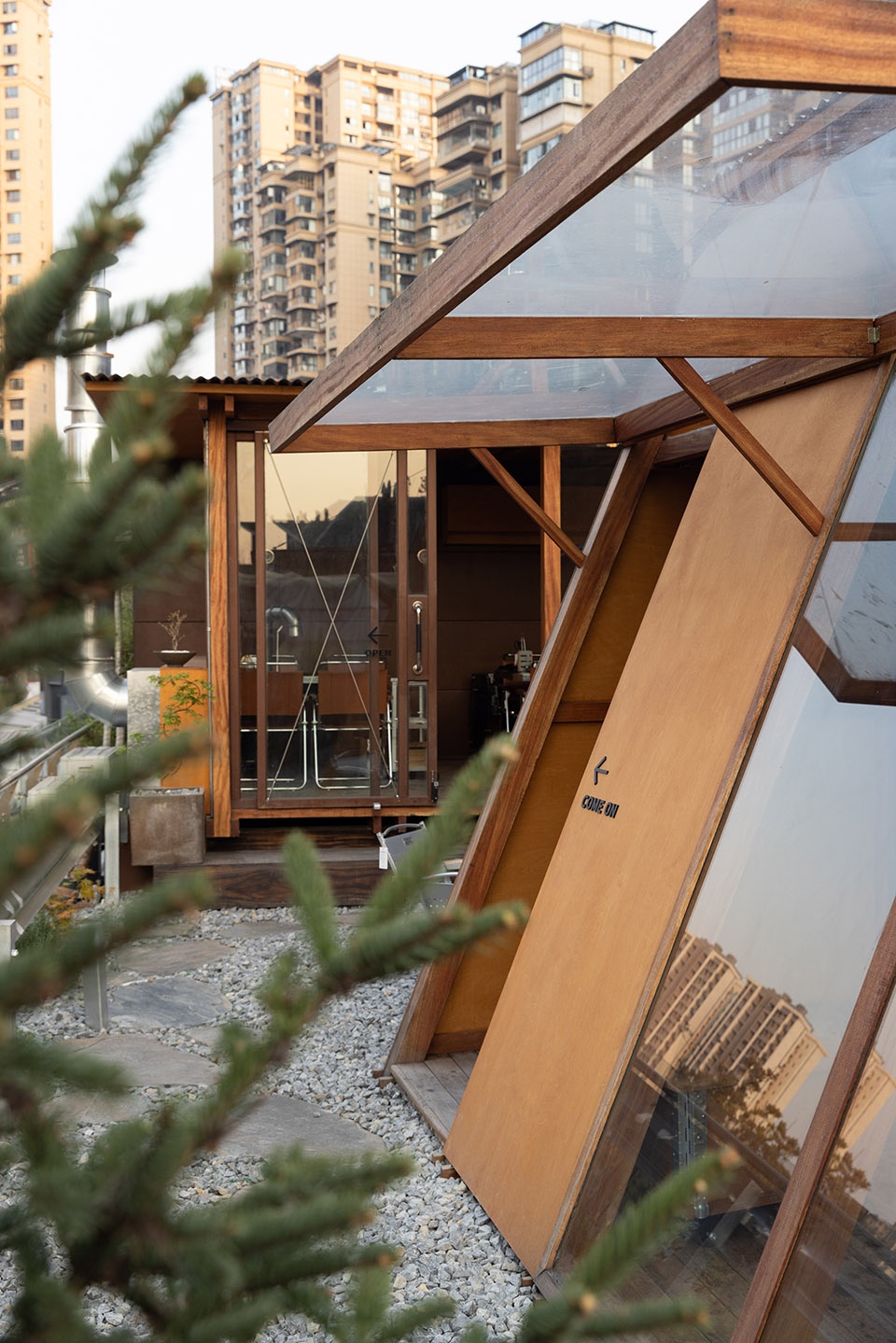建筑主体与户外庭院,利用临近户外的吧台前后衔接,建筑主体的框架结构由内延申到室外,搭建起木结构的两座小单体,呈现简单清晰的结构语言。