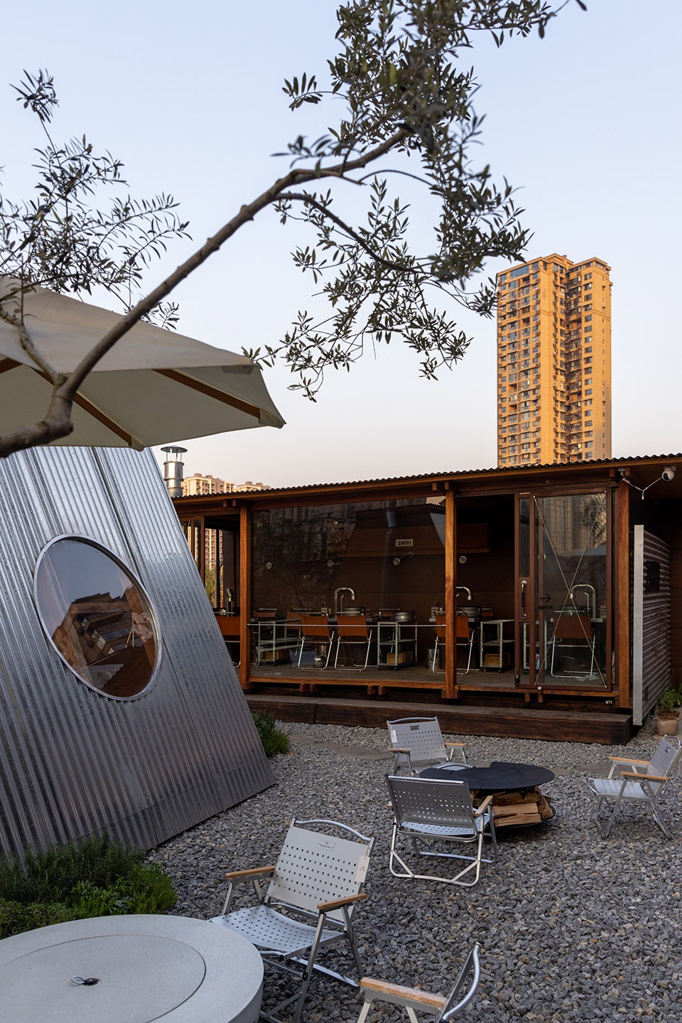 户外的封闭式小屋耐久性和坚固性会更实用,再配合前院的空地布置散座,具有灵活性,虚实相辅相成。在小木屋中,也可以通过貌似船艇的圆形窗口,窥探建筑的一角。