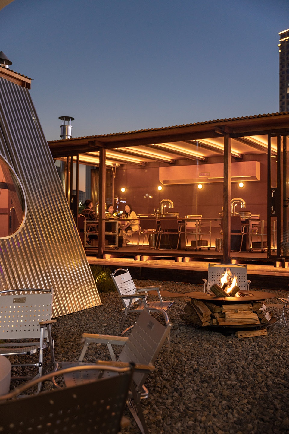 户外外摆两座木结构小屋生长其中,以高速公路护栏作为围挡线,外立面使用金属波浪板材质,内部木地板铺设,木结构与饰面板的交辉相映,纹路清晰。
