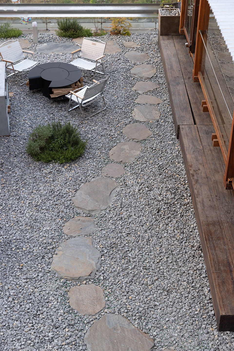 青石板路面和小石子的配合让小屋的独立感与精致感上升,踏着汀步,绕到三角木屋的后方。发现还有个小后院,环绕式的动线更具有移步异景的园林感。偶尔坐在这儿喝个小酒,吃吃烧肉,温暖灯光下简直是人生一大乐事。