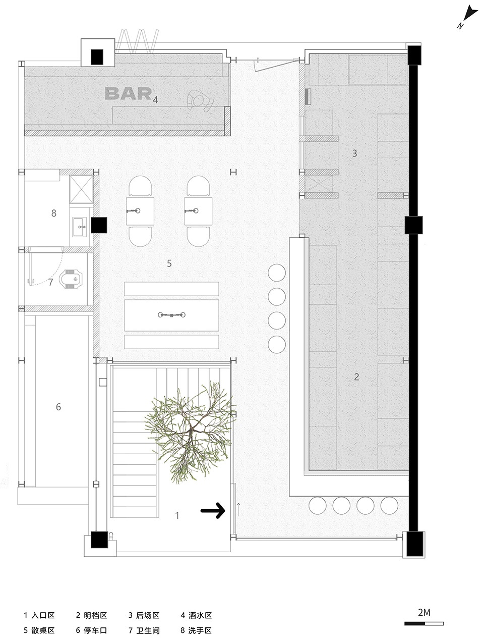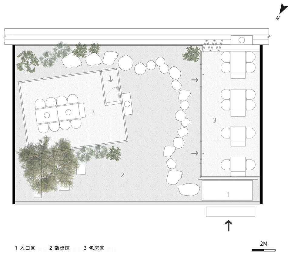 The main body of the building and the outdoor courtyard are connected front and back by the bar adjacent to the outdoor area. The framework structure of the main body of the building extends from the inside to the outside, and two small wooden single structures are built, presenting a simple and clear structural language.