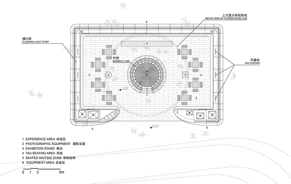限定场地边界,利用墙的厚度隐藏所有机电设备。竹地板与竹条编织的墙体构成墙地一体的效果,形成连续而通透的织构逻辑。竹墙的外侧与预制装配的竹凳顺势延展,使墙体边界自然向城市打开,形成一种既开放又具亲和力的姿态,引导太古里广场上的行人驻足、休憩,促成装置与城市生活之间的日常互动。