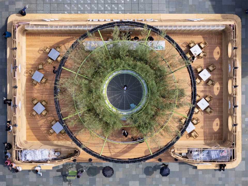构成竹林的均为新鲜的带叶真竹,每株鲜竹均结合轻盈环形骨架形成由内而外的环形放射弯折状态,现场以插接的方式与中央的清风体验装置快速固定,丛丛竹叶从伞架垂挂而下,围合出一丛都市广场上的生态竹林,构成了整个茶馆空间的精神核心。