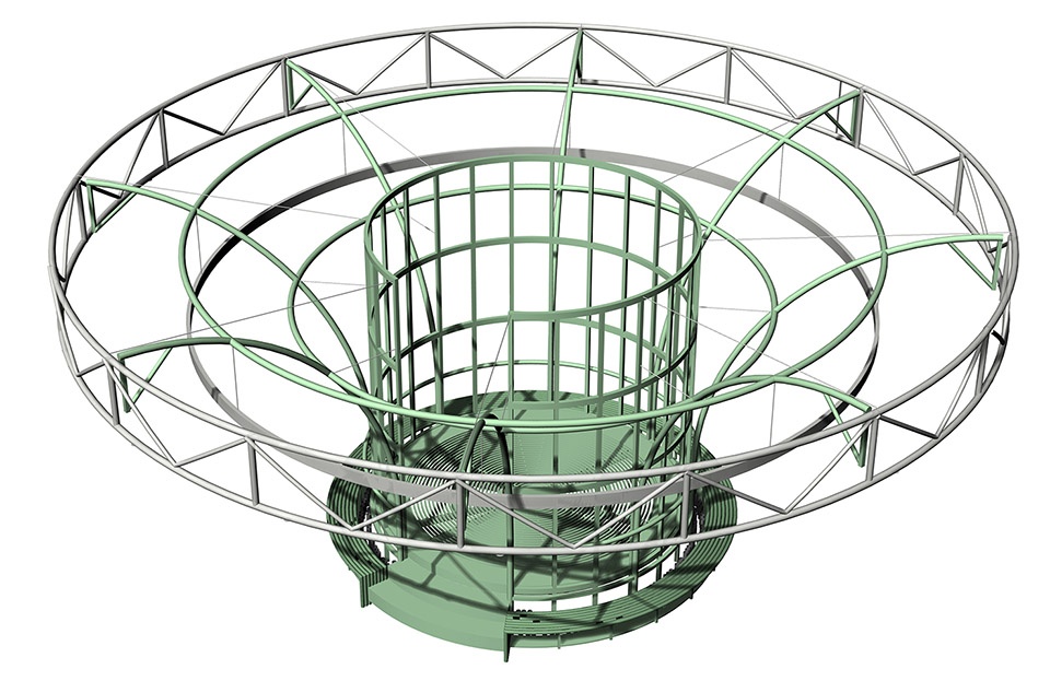 竹的轻盈、柔韧与快速搭建性,使其天然适配本次即时构筑的需求。装置核心围绕体验风圈,内外双环构成上下两个筒状结构,底部连接,上部钢索拉结,轻盈体系承托约2吨的冰屏外环,构成稳定而轻盈的伞架体系。