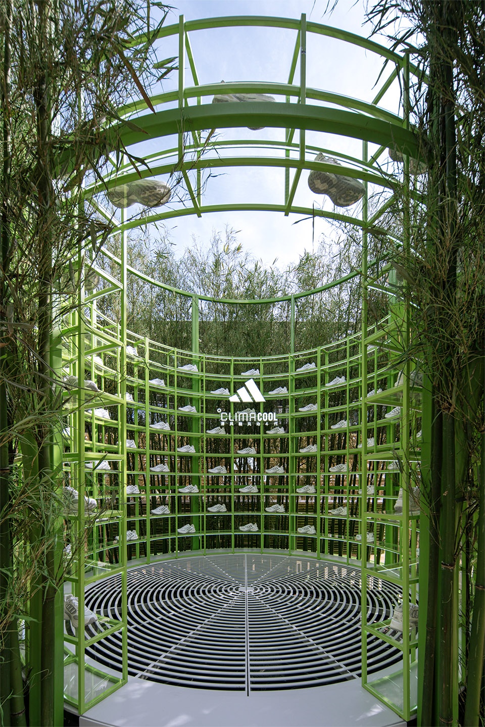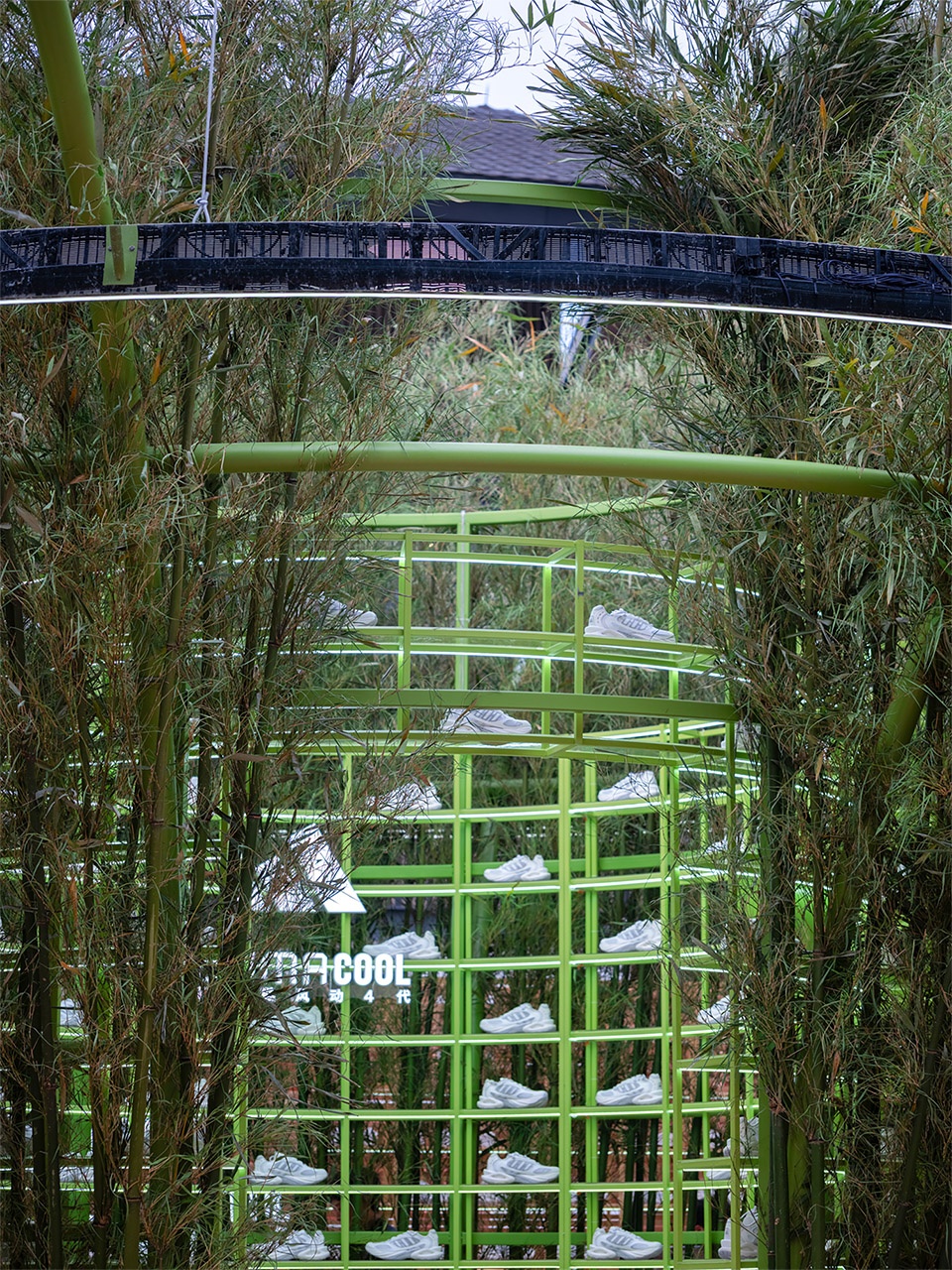 To echo the theme of the brand’s new Climacool running shoe, the team was asked to create a level-5 breeze effect at the center of the installation—an upward airflow paired with the outward rhythm of a bamboo grove, producing a perceptible sensation of coolness. We explored wind turbines, centrifugal blowers, even the possibility of indoor skydiving systems. In the end, a low-tech solution proved most effective: twelve fans linked to a unified control circuit, activated and modulated at set intervals. As visitors entered the central ring wearing the new shoes, a breathable breeze rose from beneath their feet—turning coolness into something tactile.